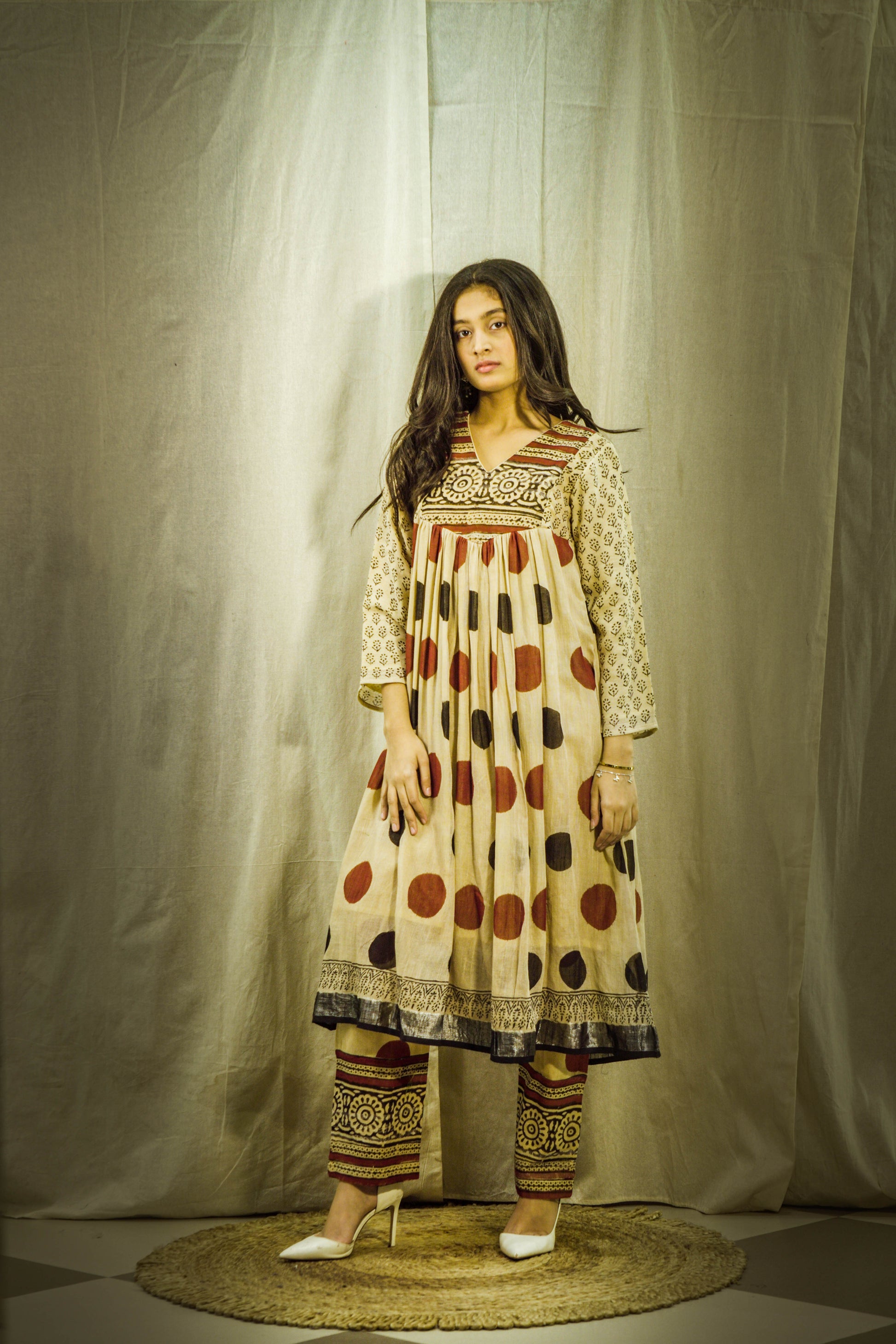 Set on a soft beige base, the fabric is adorned with red and black polka block prints, carefully handcrafted by skilled Indian artisans using traditional printing techniques. The playful polka motifs add a distinctive character while maintaining the elegance of the ensemble.