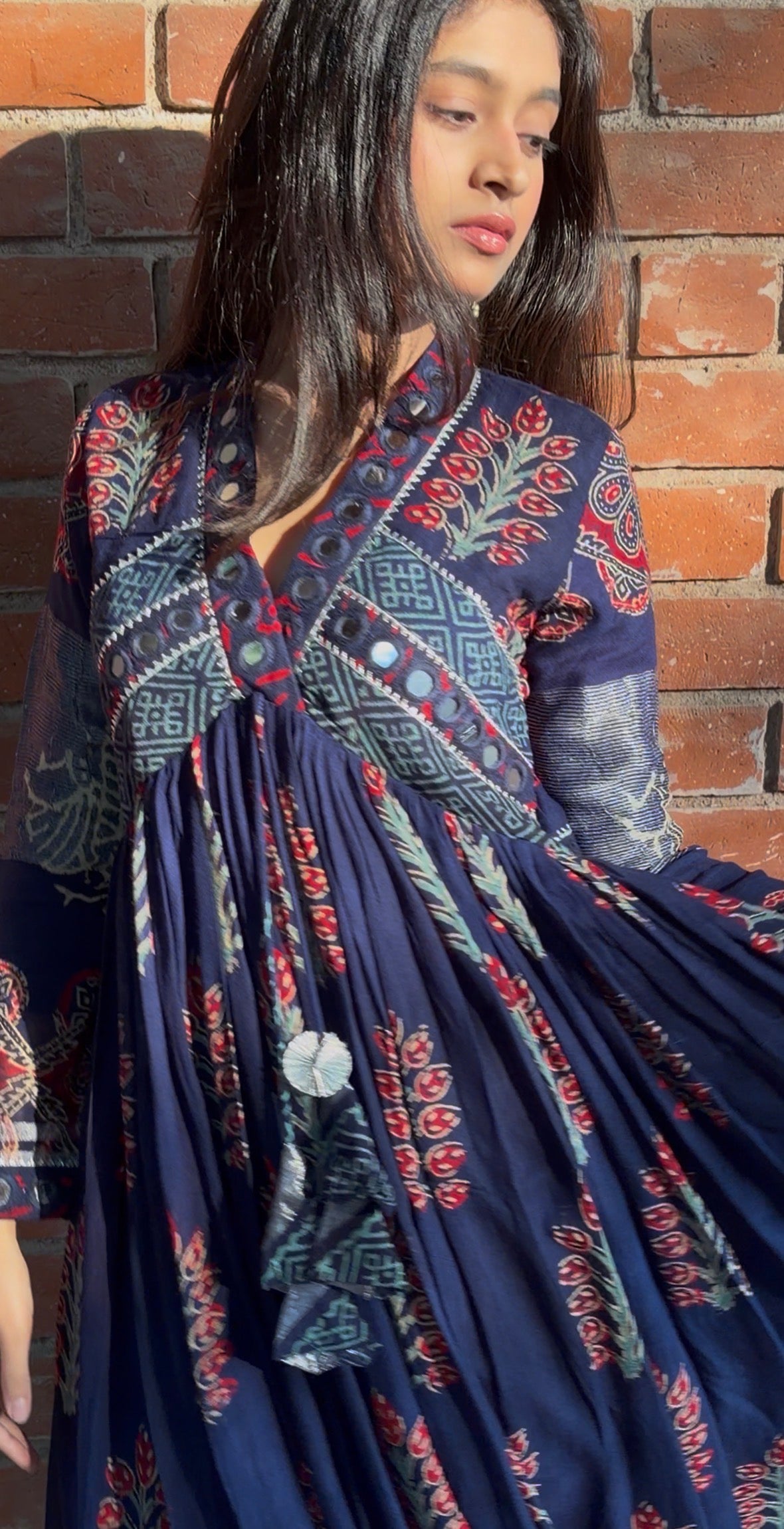 Note: As this garment is handcrafted using traditional block printing and hand mirror work techniques, slight irregularities or minor variations may occur. These are natural characteristics of authentic handmade artistry and enhance its uniqueness.
