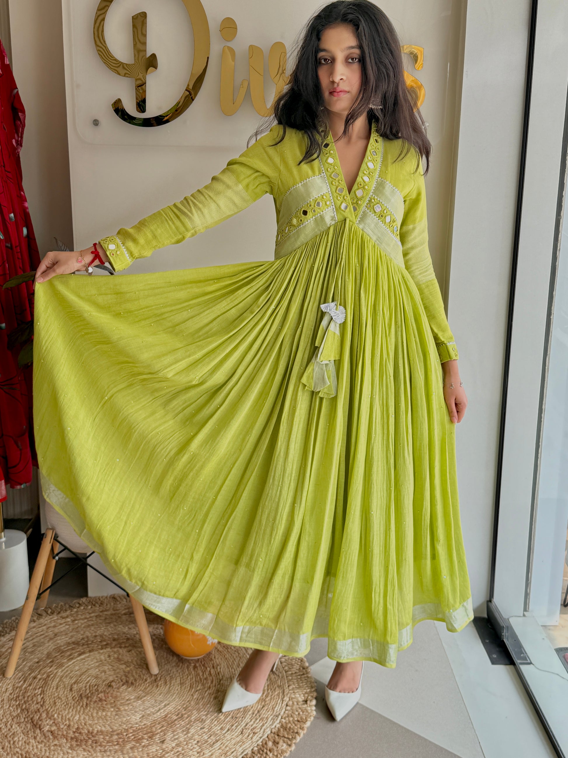 Its 5-metre flared skirt flows beautifully with every step, while functional pockets on both sides add a touch of everyday practicality. The neckline, back, and handcuffs are intricately adorned with mirror work, reflecting the artistry and finesse of Indian craftsmanship.
