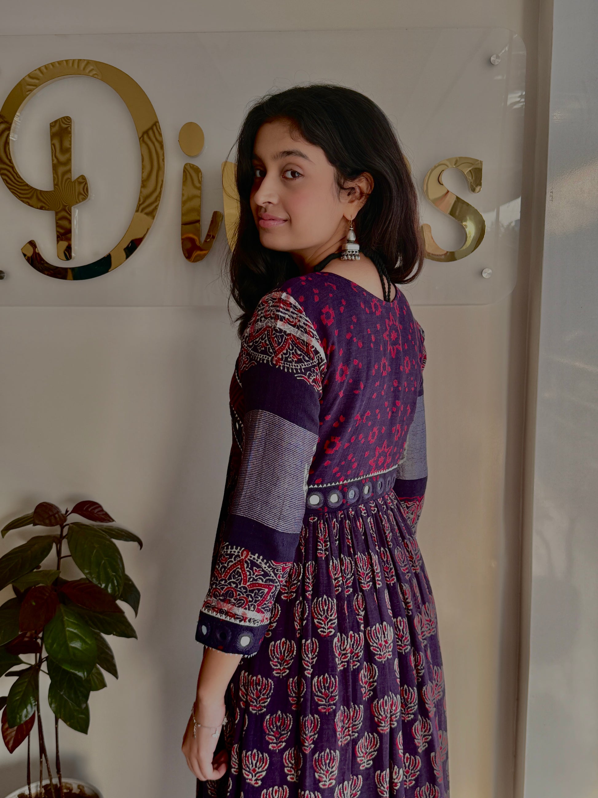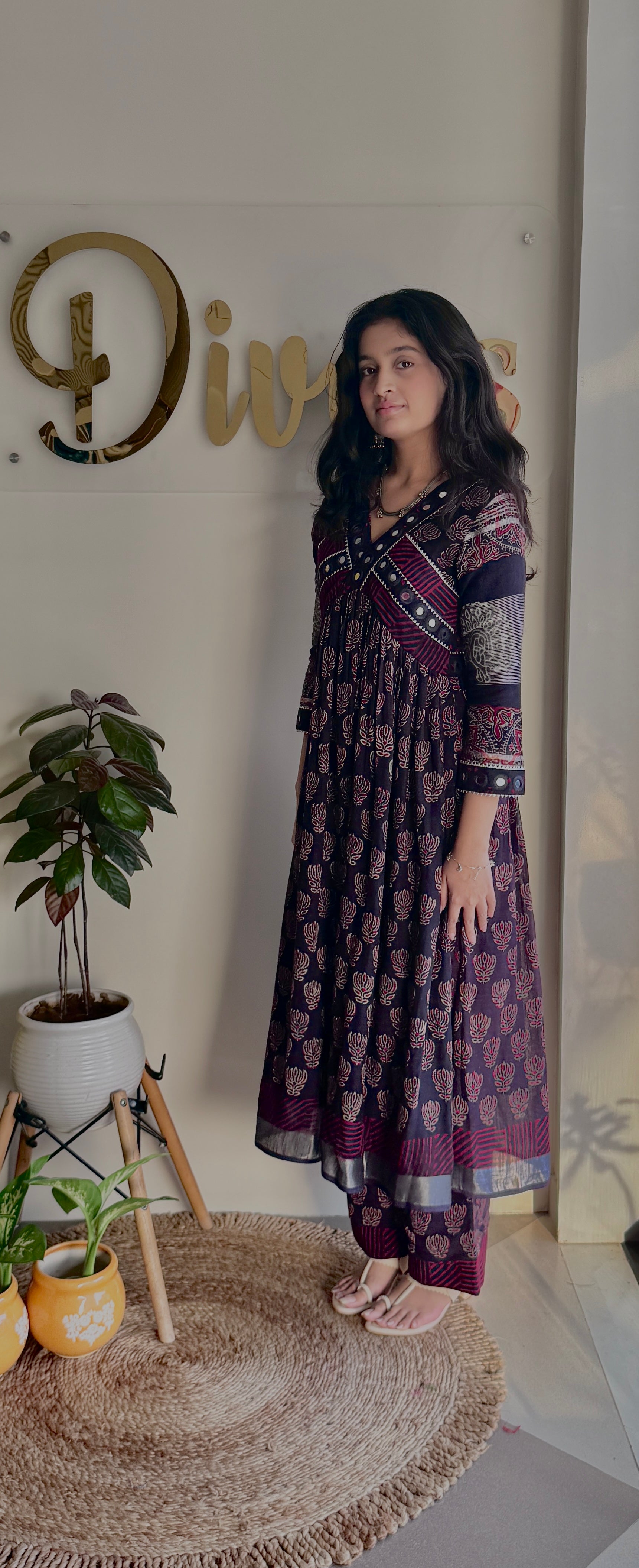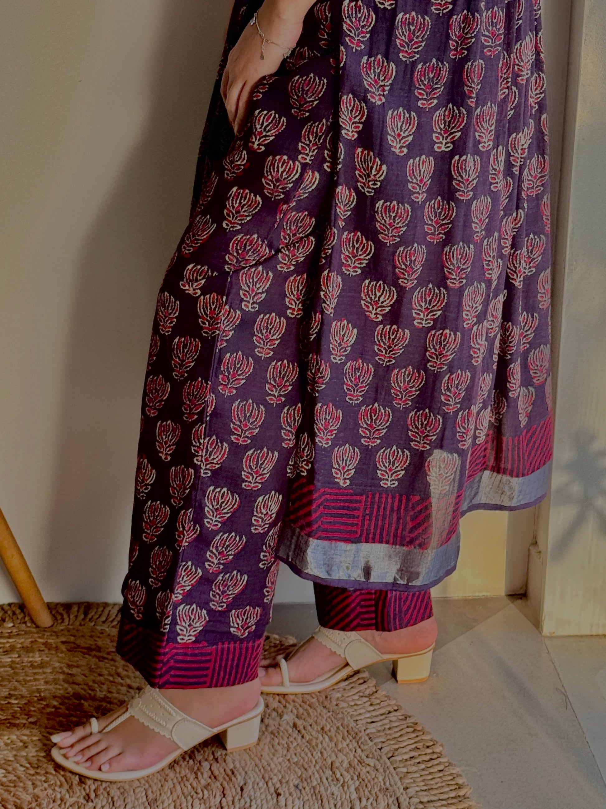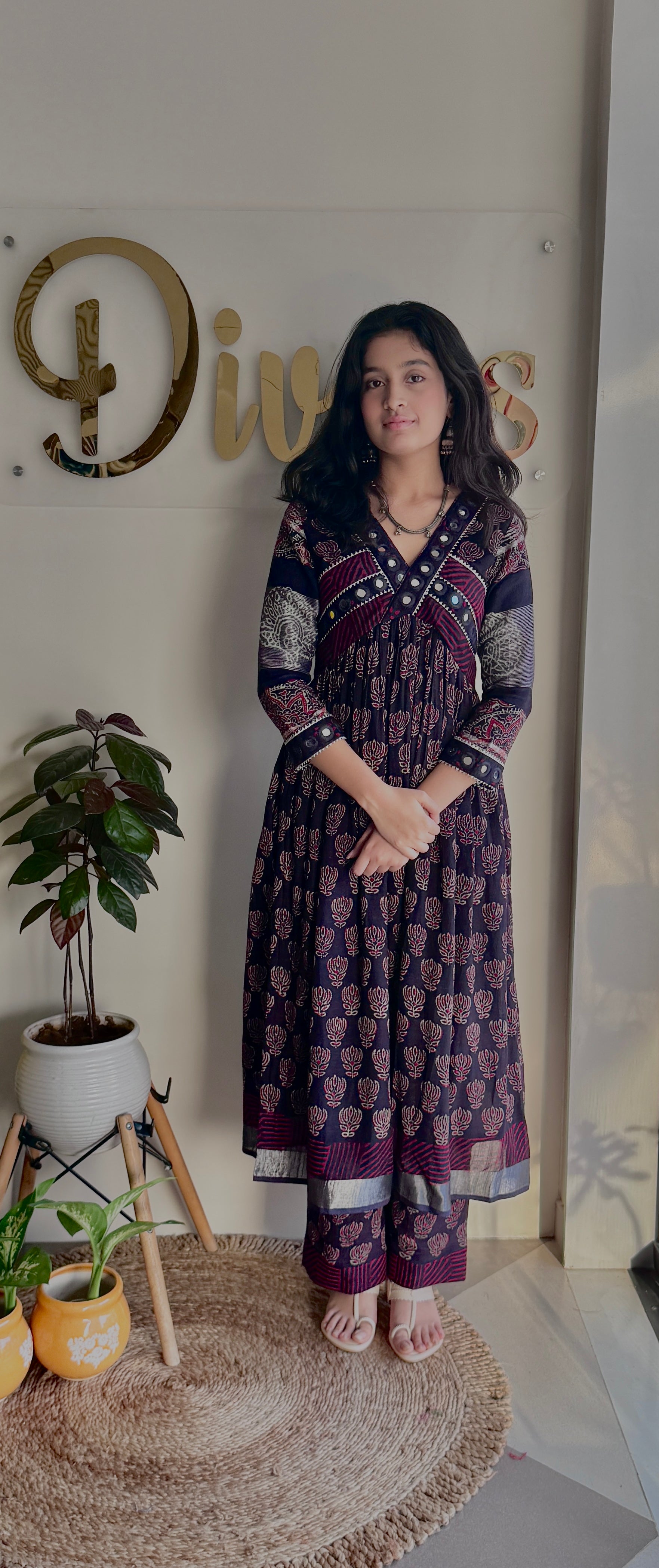 The Alvara Set is a sophisticated blend of artisanal heritage and contemporary elegance. Crafted in pure linen and lined with soft mull cotton, this pant kurta set features a deep purple base adorned with vibrant red and green hand block motifs. Real mirror work embellishes the neckline, handcuffs, and back belt, adding delicate sparkle and festive charm. Side slits on the kurta ensure comfort and fluid movement, making the Alvara Set perfect for celebrations, gatherings, or refined everyday wear.