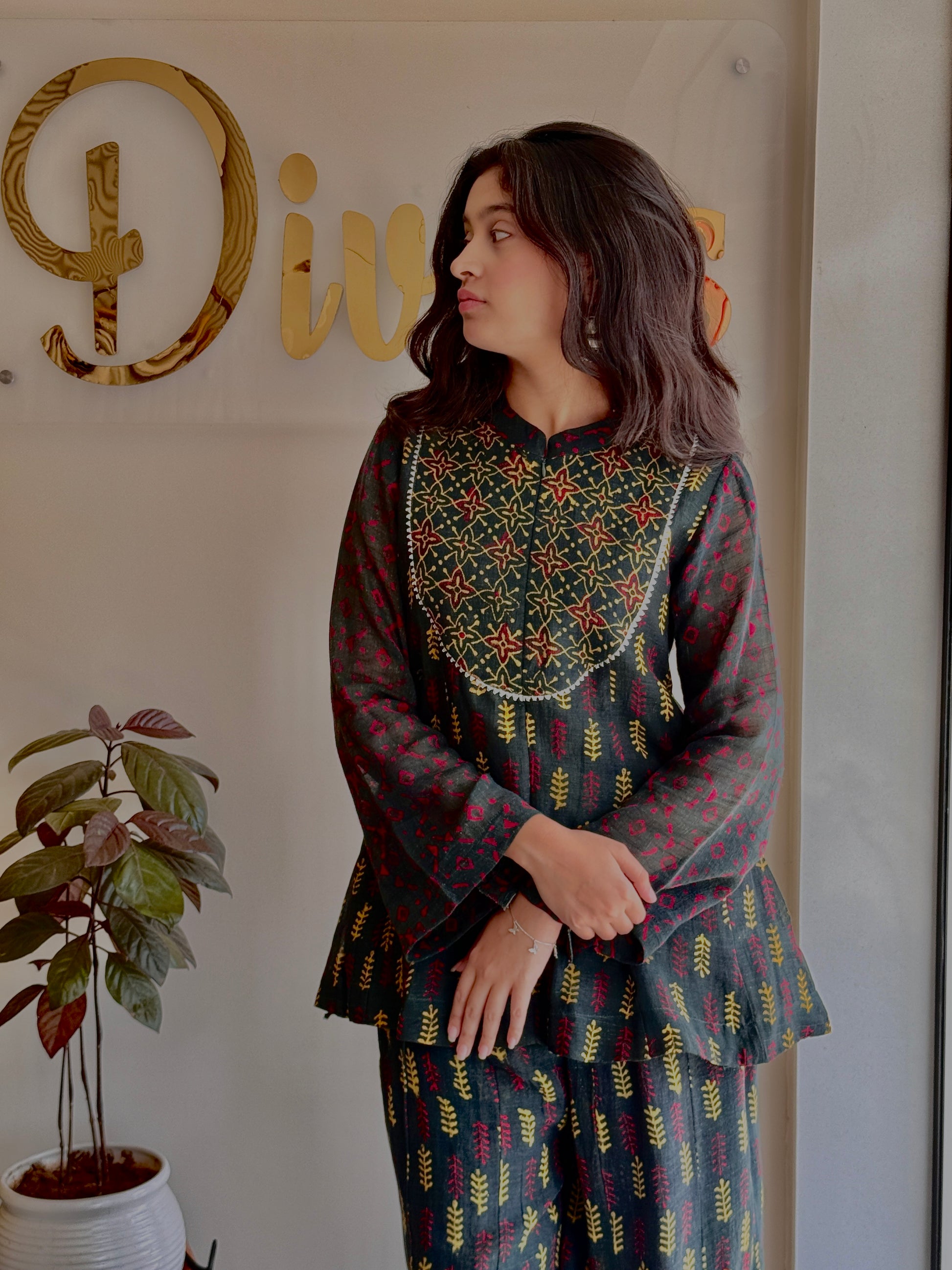 Hand block printed by skilled Indian artisans, the dark green base carries intricate patterns that celebrate heritage artistry. With its breathable fabric and refined detailing, Aureya is the perfect balance of festive sophistication and effortless wearability—a true statement piece for every occasion.