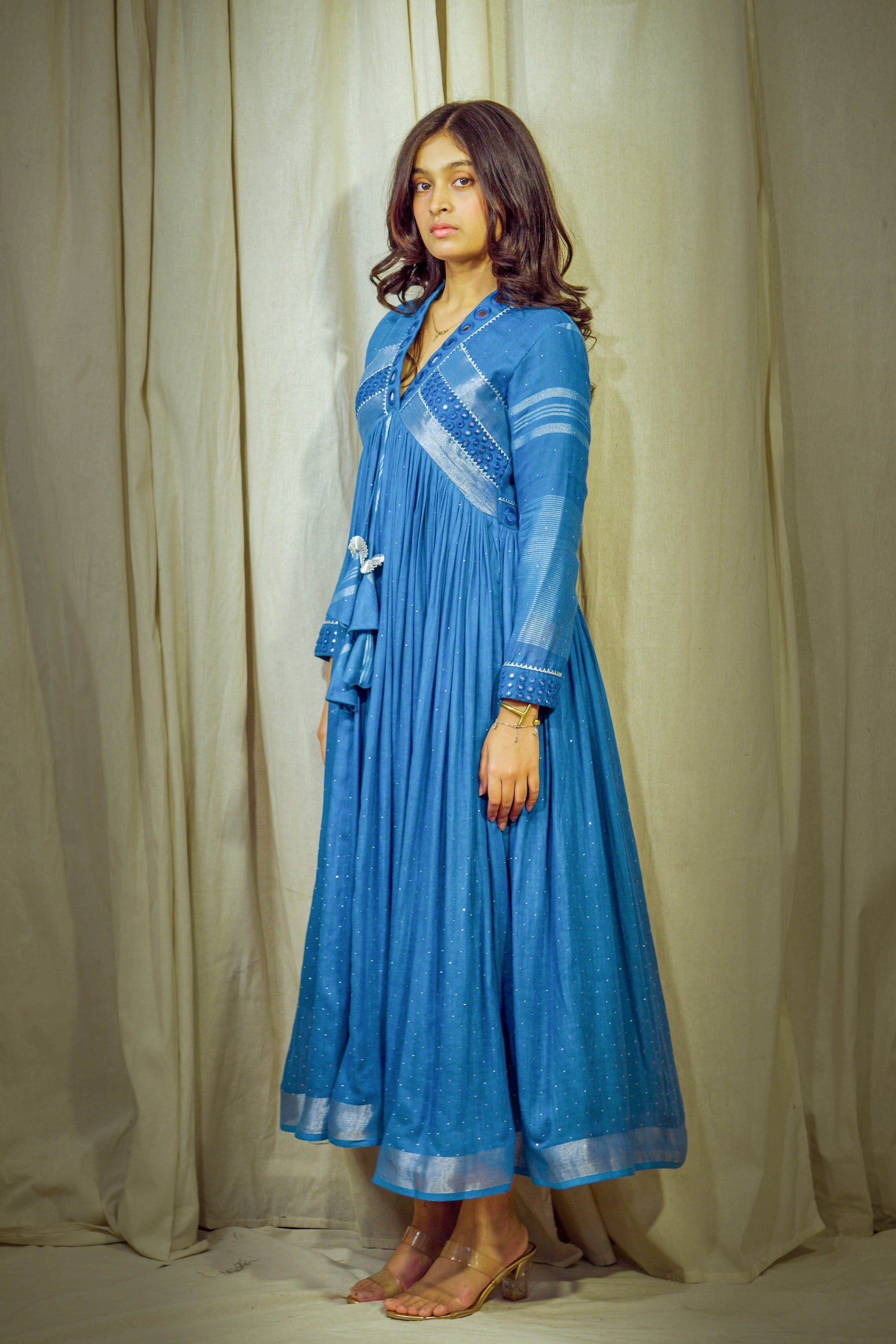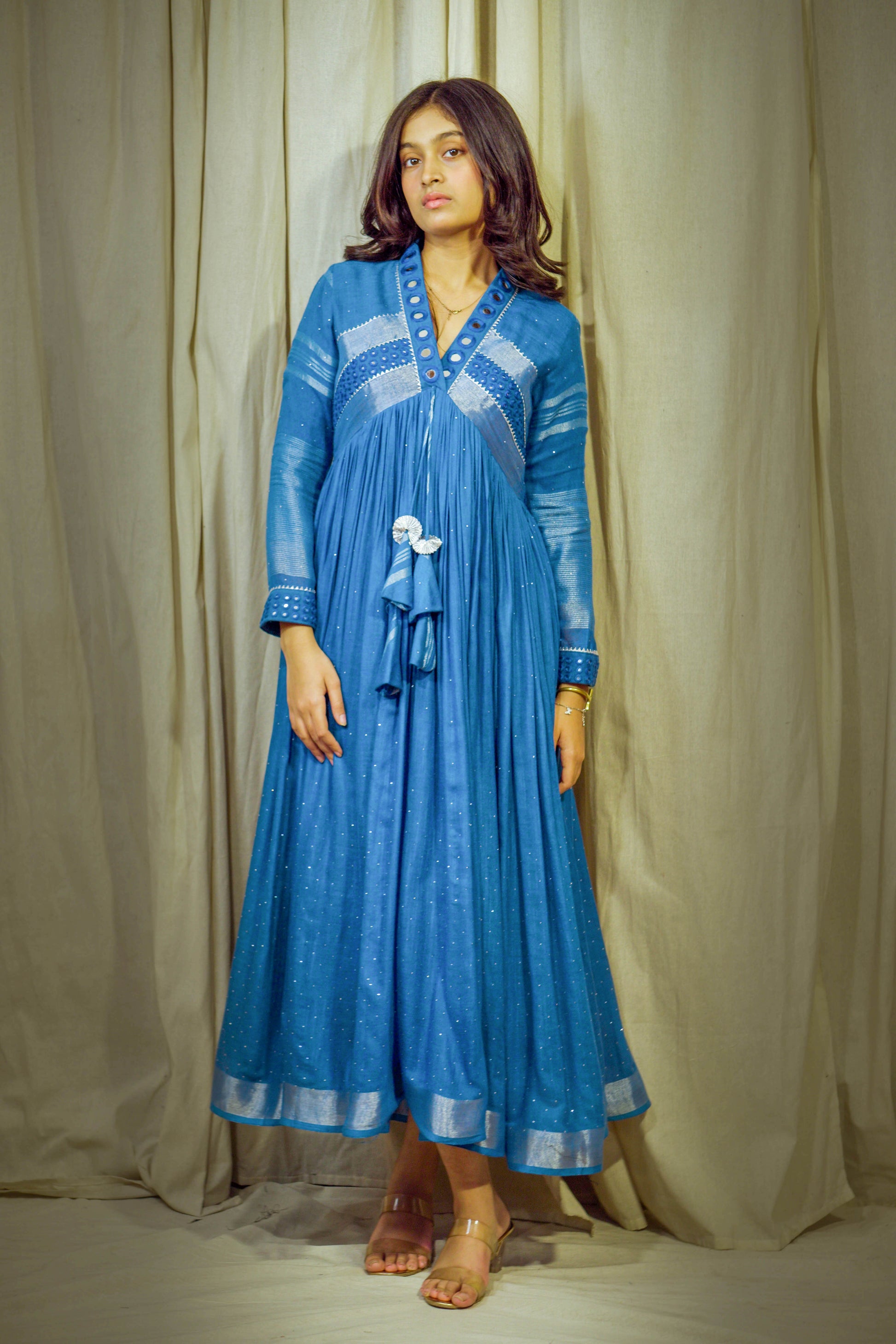 Devyani – Royal Blue Pure Linen Flared Dress with Mirror & Mukesh Work