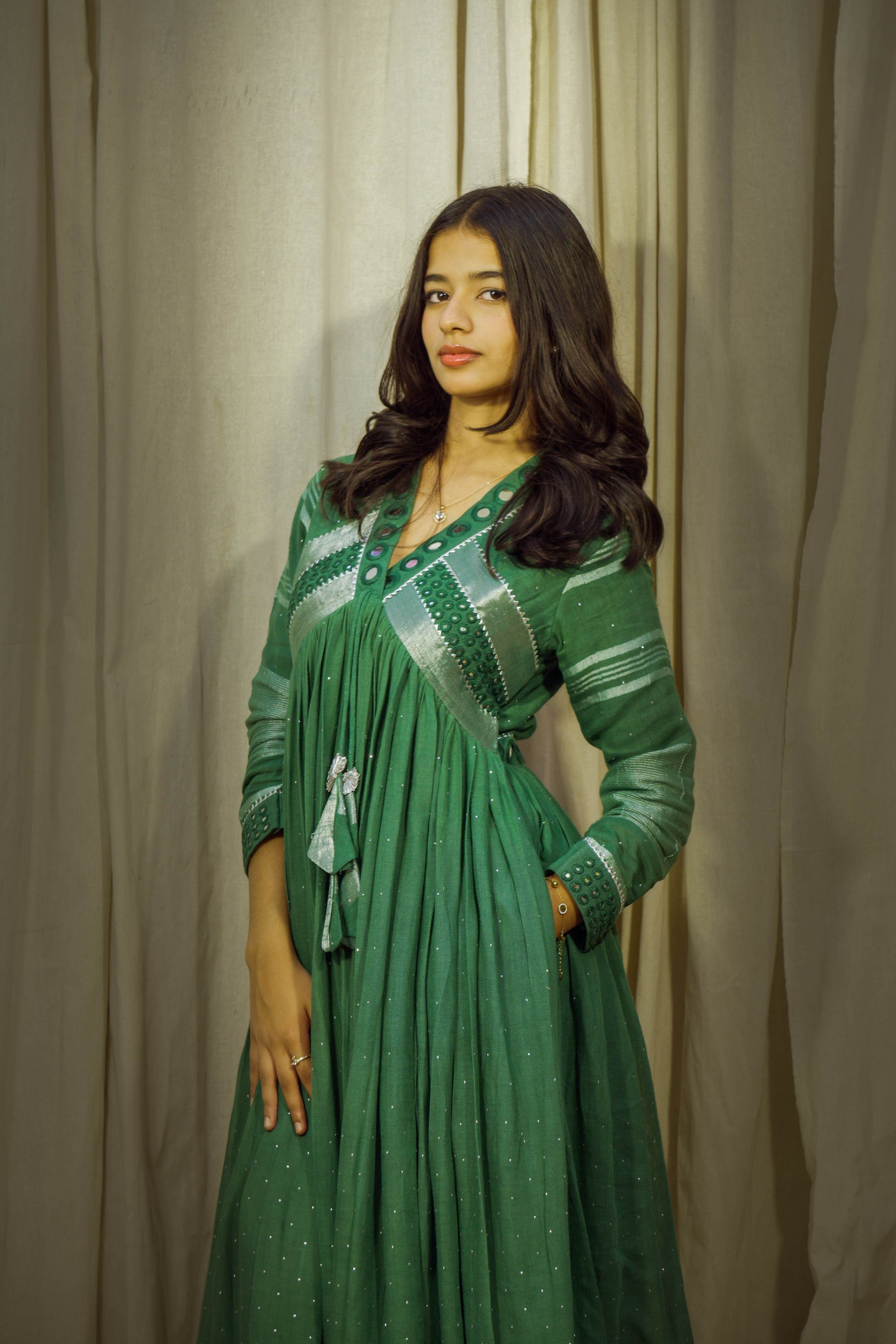 Drenched in a rich bottle green, the colour evokes lush canopies and moonlit forests — regal, grounding, and quietly powerful. Across this elegant canvas, hand-done stone work glistens like morning dew, adding texture and a soft shimmer to every fold and flare.