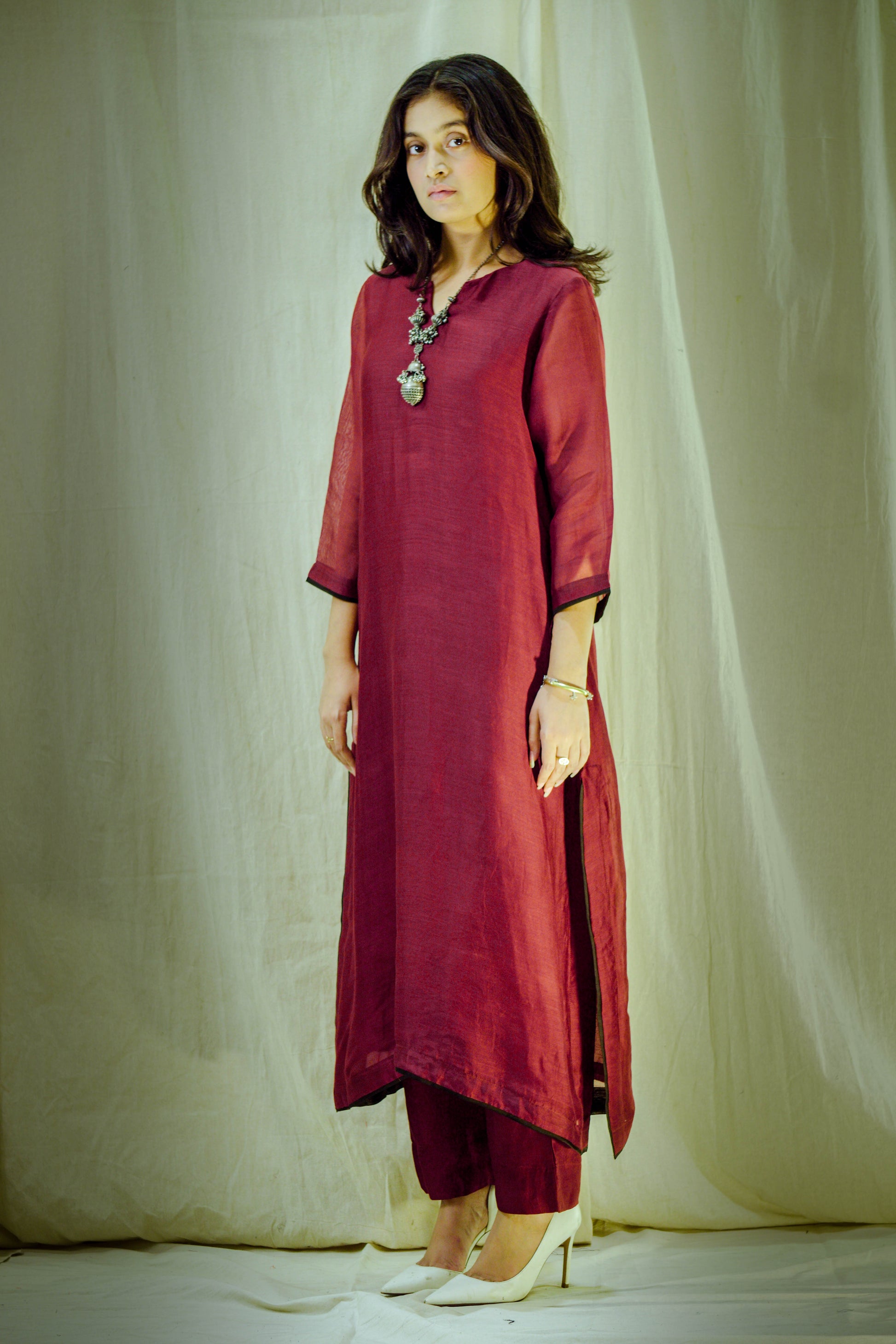 The rich maroon hue evokes warmth and regality, making it a versatile essential for every refined wardrobe. Whether styled with a vivid bandhani dupatta for festive occasions or paired with a classic kalamkari drape for understated charm, this ensemble transitions effortlessly from day to night.