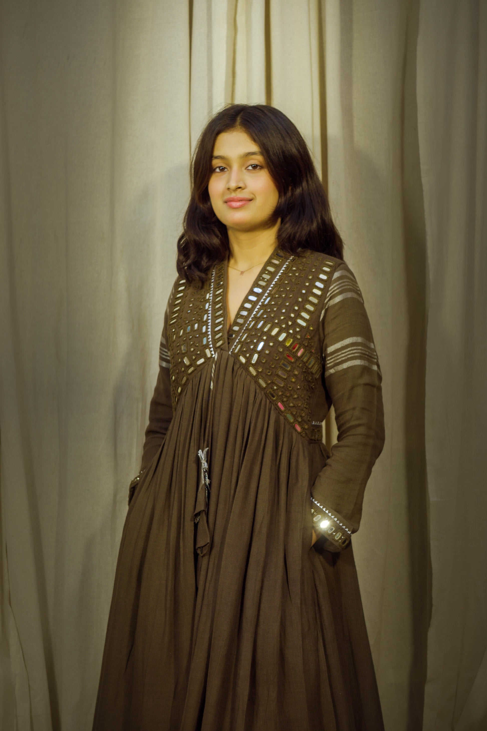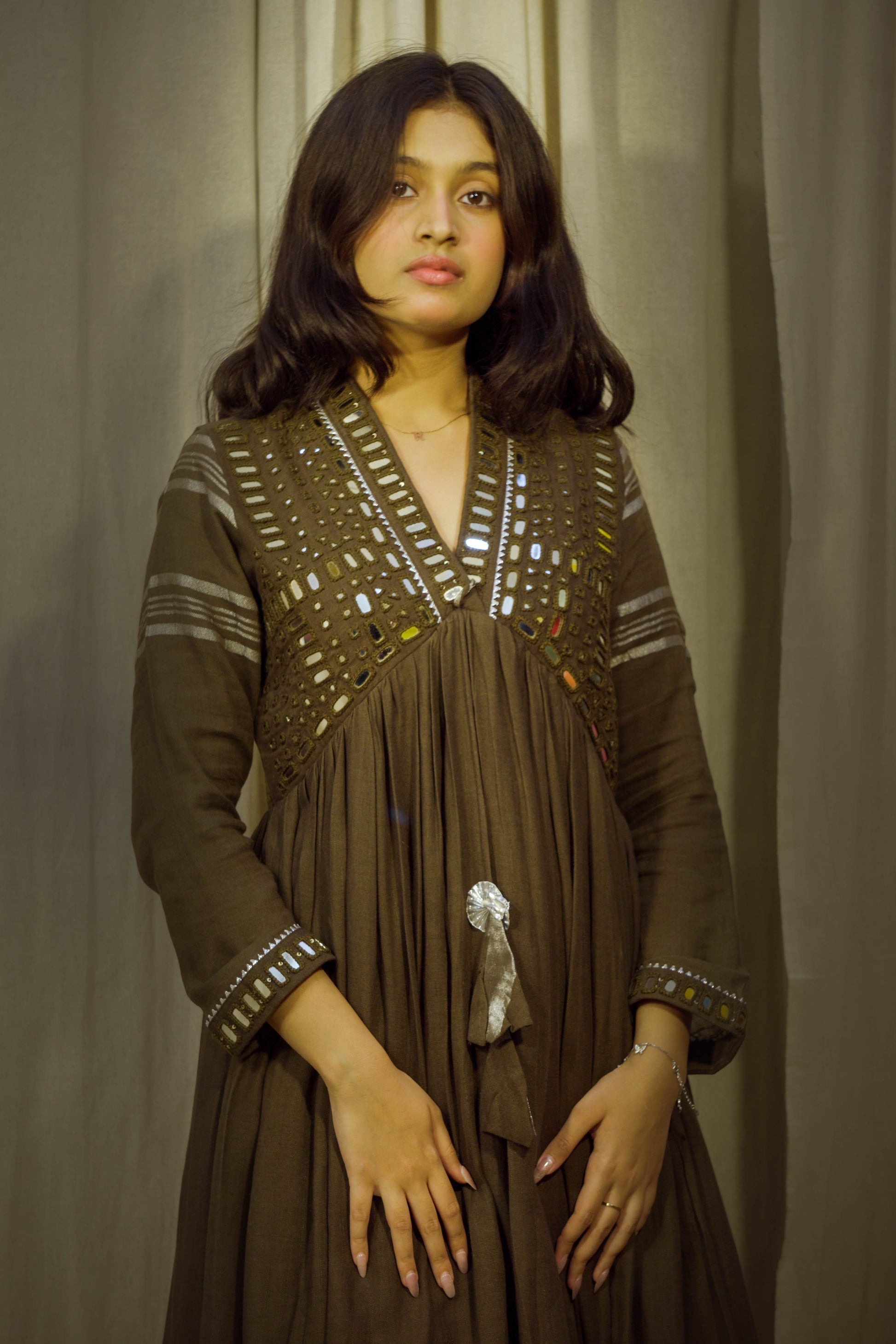 The color — a warm, grounded ocher brown — evokes the richness of sunbaked earth and antique gold. It’s both regal and raw, making it the perfect canvas for the all-over mirror work that glistens across the entire top, handcuffs, and back. Each mirror is meticulously hand-embroidered, reflecting tradition, craftsmanship, and the quiet drama of light catching on fabric.