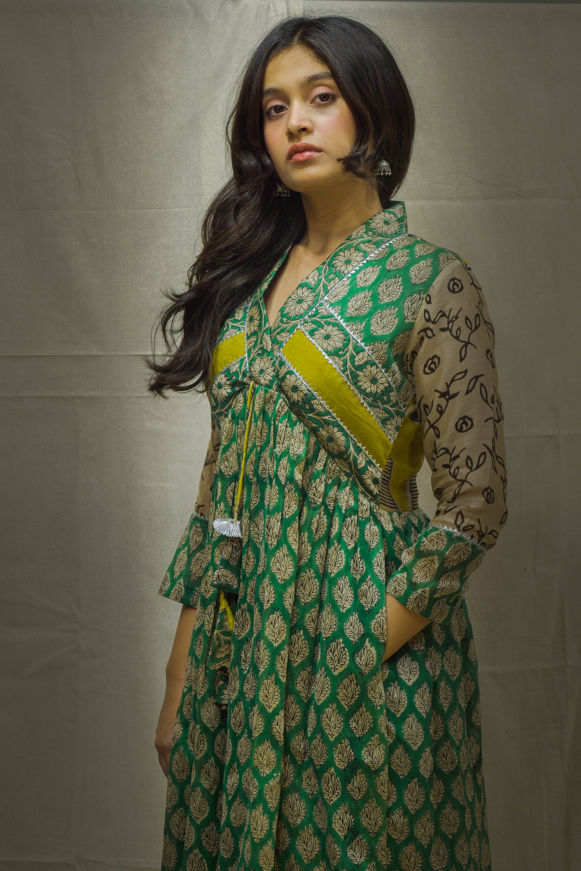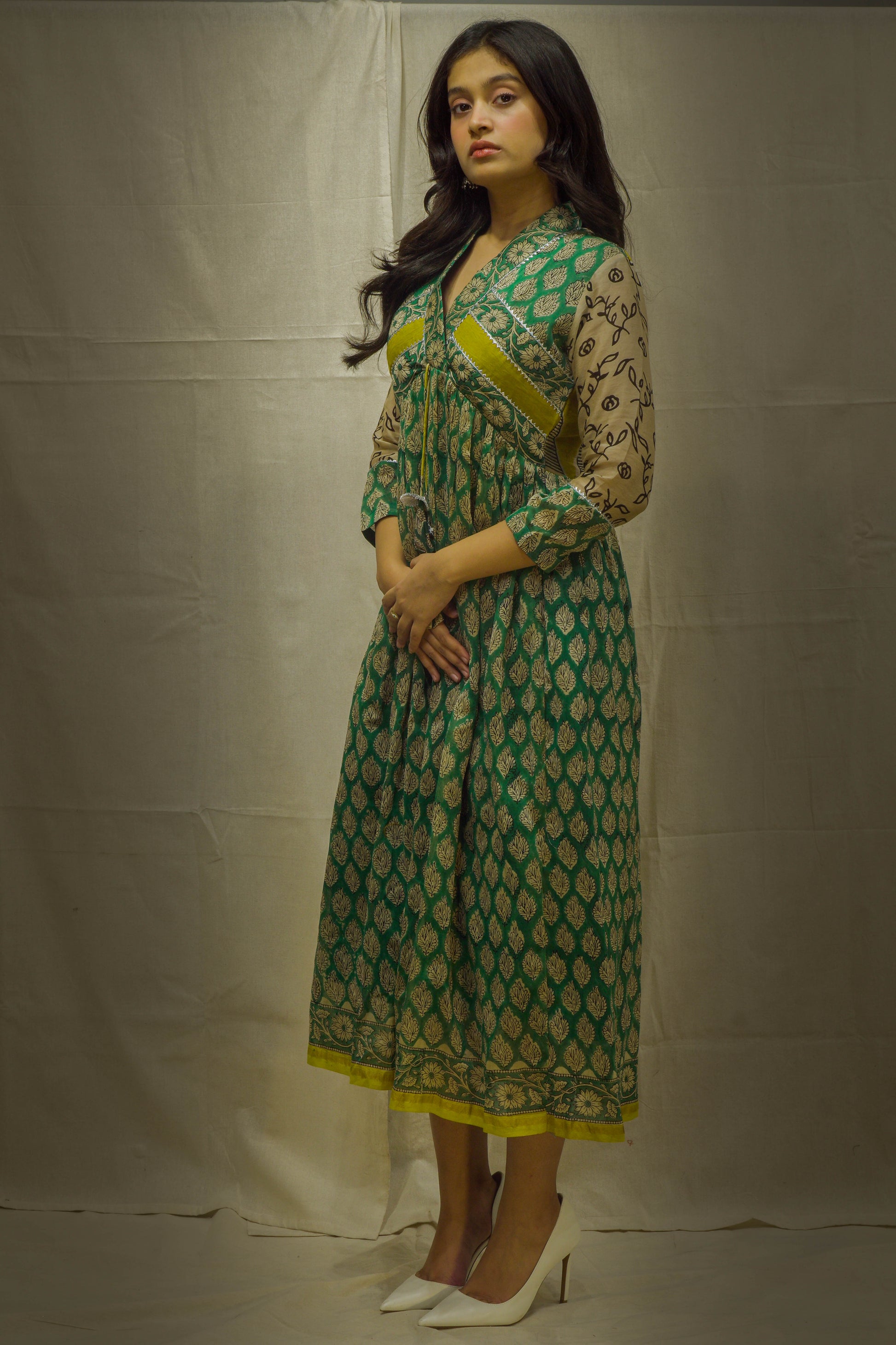 The kurti features a full inner lining for a smooth, comfortable fit, while hidden pockets on both sides add a touch of practicality, ensuring convenience without compromising on style. The deep bottle green color paired with the fine handblock printing creates a sophisticated aesthetic, making this kurti a standout piece in any wardrobe.