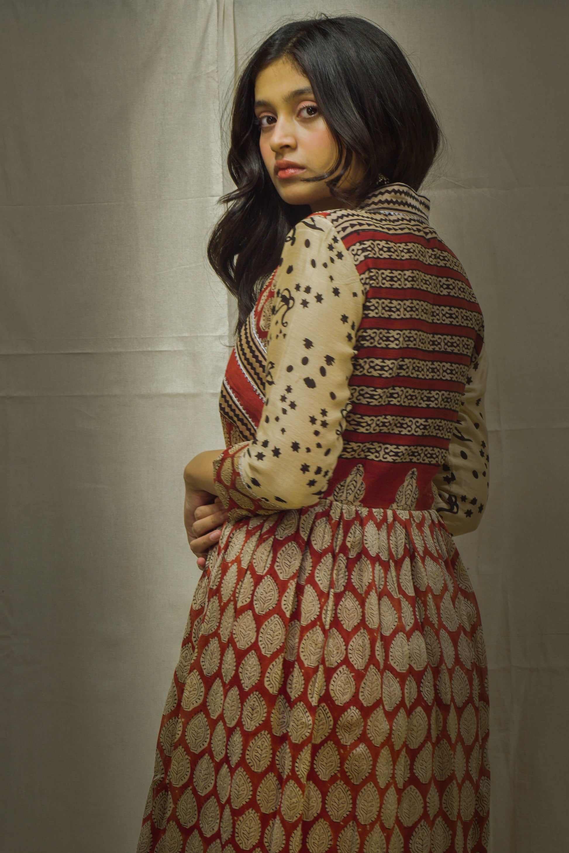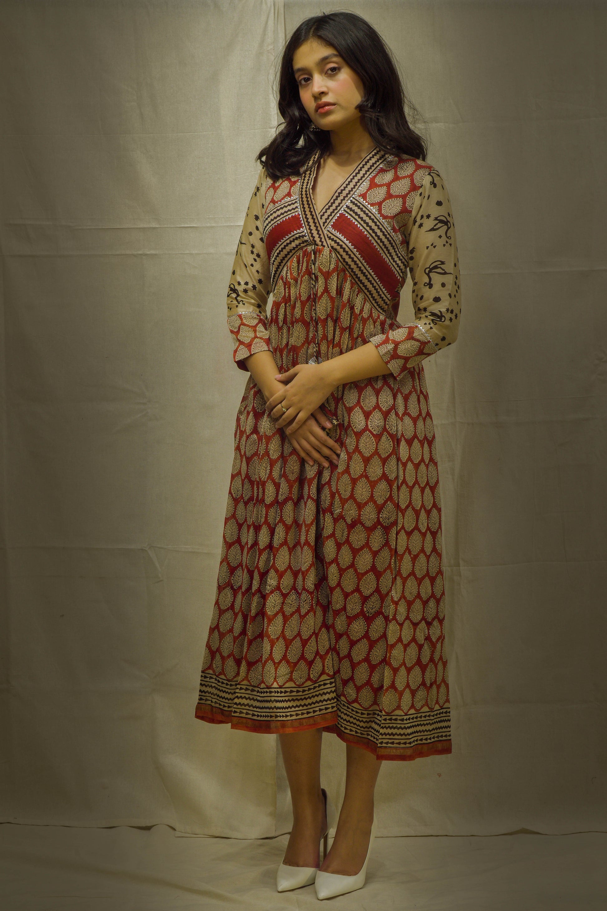 Step into refined elegance with our Ina Chanderi Kurti, a sophisticated composition of rich maroon leaf motifs set against a creamy backdrop. Crafted from pure Chanderi fabric, this kurti is handblock-printed with intricate leaf designs that blend tradition with contemporary artistry.