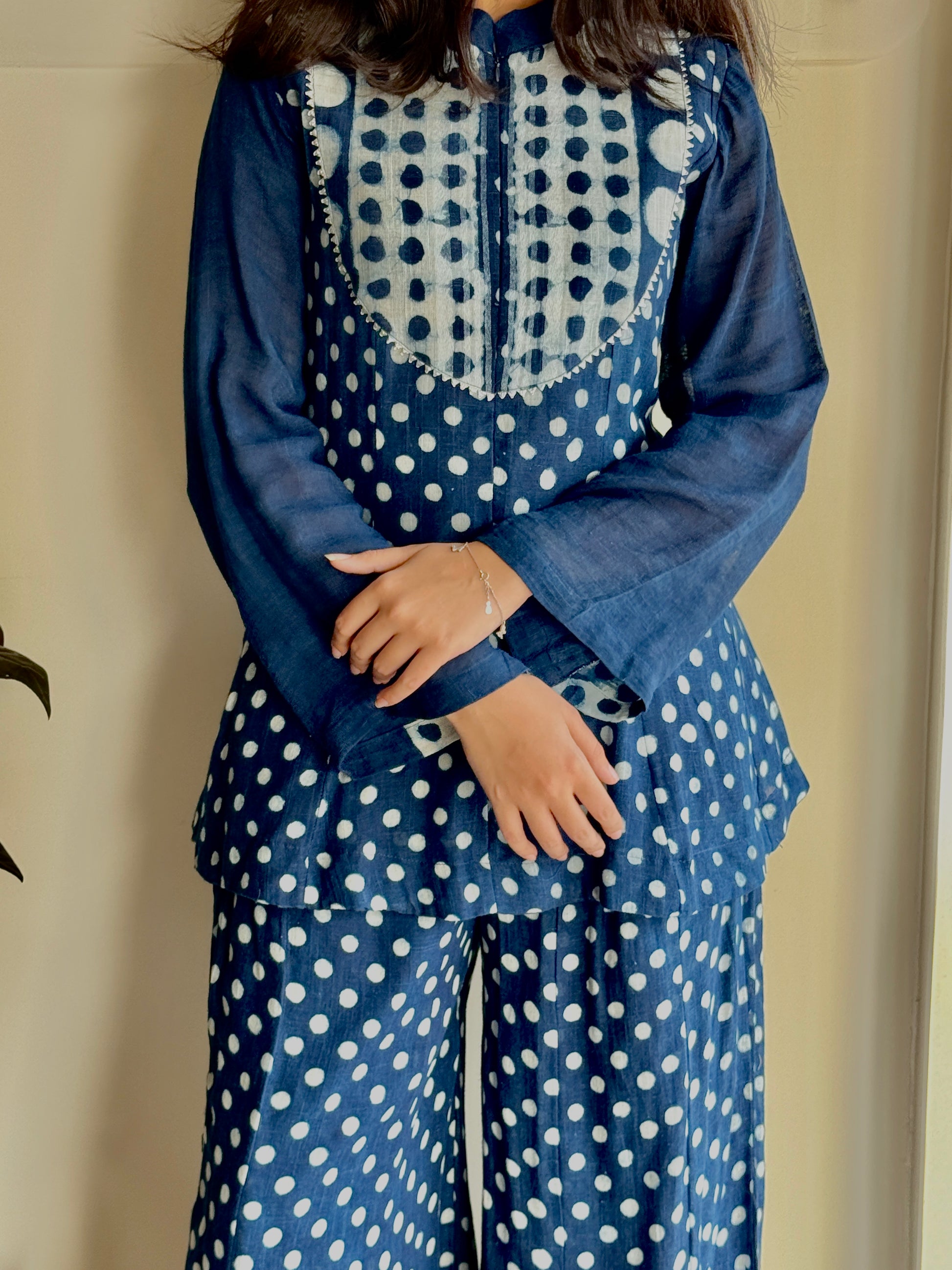 The Indigo Tala set is a perfect blend of comfort, artistry, and timeless style. Crafted in pure linen, the set features a top with elegant bell sleeves and box stitching, paired with matching bottoms for effortless sophistication. The indigo canvas is adorned with charming white polka dots, hand block printed by skilled Indian artisans, making each piece uniquely enchanting. Ideal for those who love heritage-inspired design with a modern, playful twist, this set brings artistry and elegance into everyday wear.