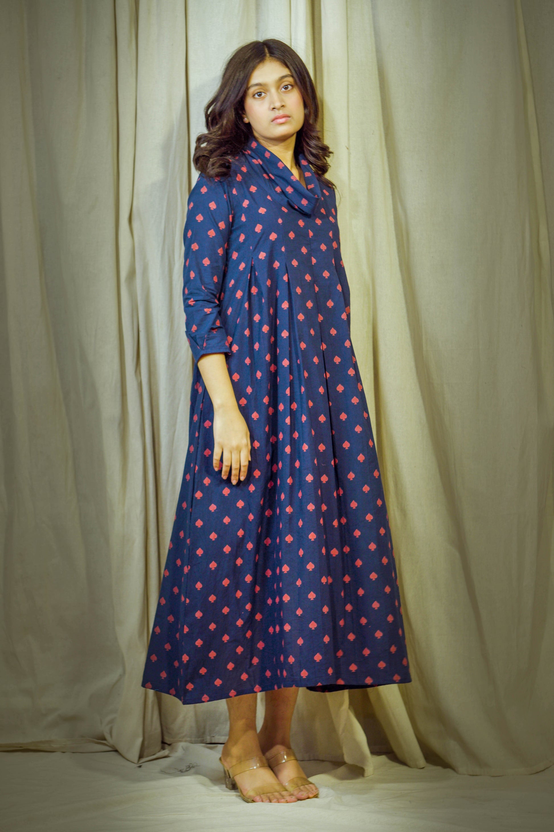 Classic with a bold twist, Laalya Vrishti is a pure cotton Polo Box Tunic showcasing traditional Soliater block-printed red boxes on a rich navy blue background. This striking color combination brings a touch of vibrancy to a timeless silhouette, creating a look that’s rooted in heritage and styled for the modern day.