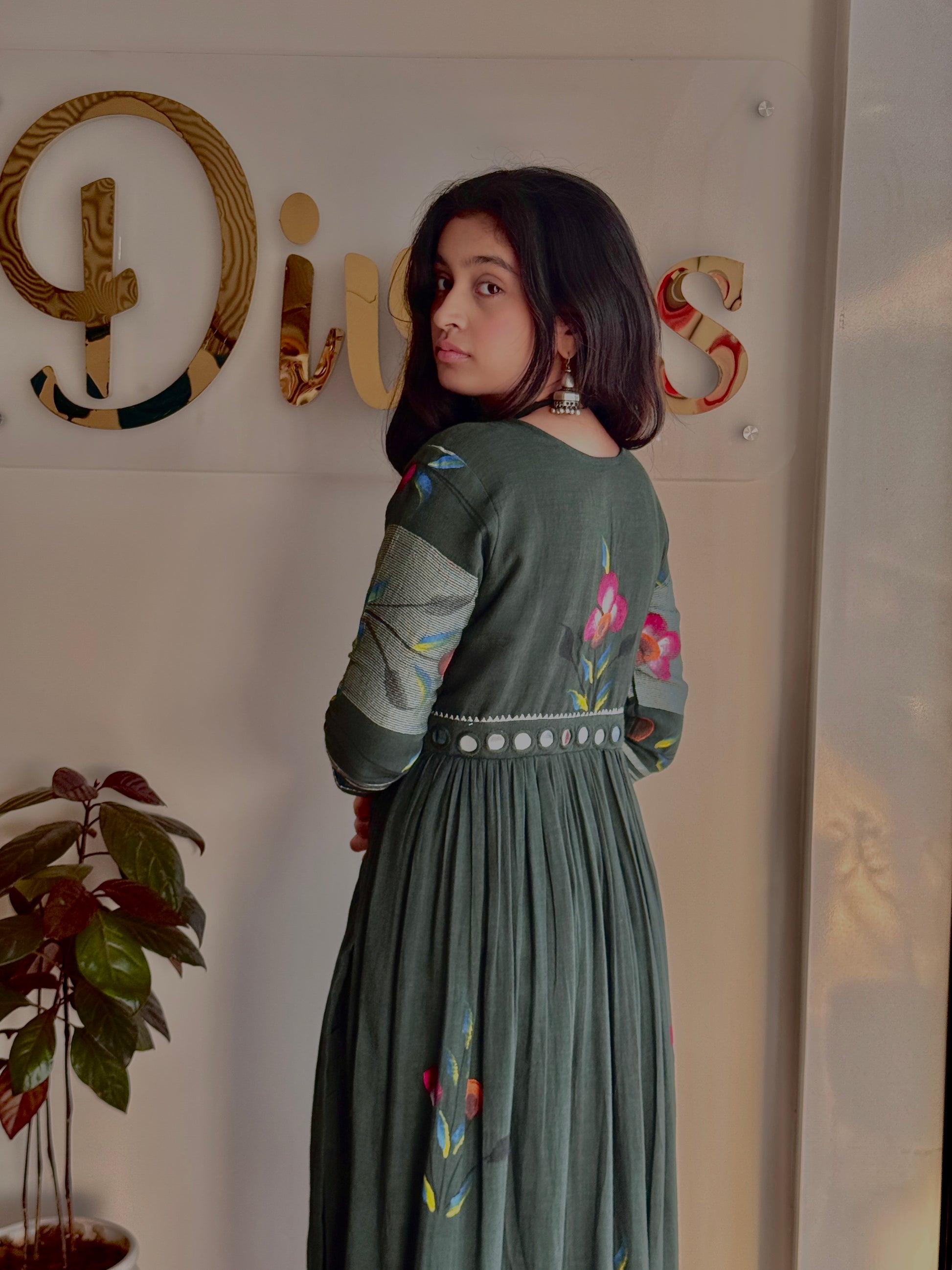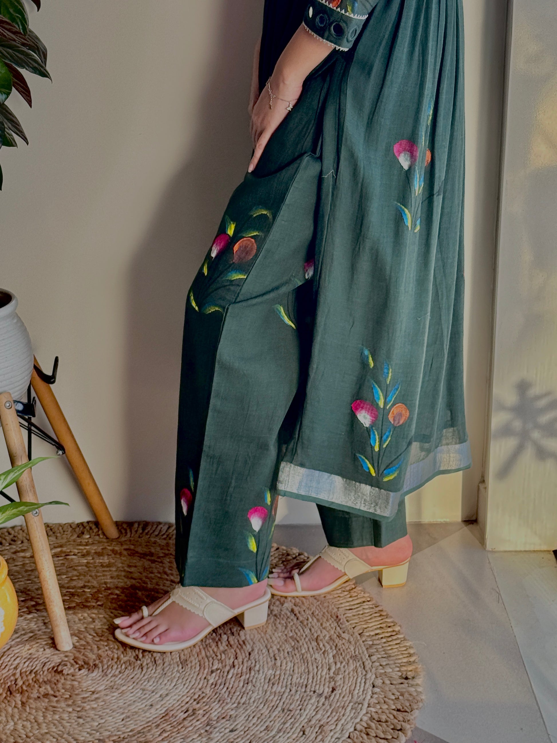 The Liyana Brush Painted Pant Kurta Set is a celebration of artisanal craftsmanship and modern elegance. Crafted in pure linen and lined with soft mull cotton, this pant kurta set features a deep bottle green base adorned with exquisite hand-painted floral motifs, meticulously created by skilled Indian artisans. Real mirror work embellishes the neckline, handcuffs, and back belt, adding delicate shimmer, while side slits on the kurta ensure comfort and fluid movement. Perfect for festive occasions, gatherings, or elegant everyday wear, the Liyana Brush Painted Pant Kurta Set blends vibrant heritage artistry with contemporary sophistication.