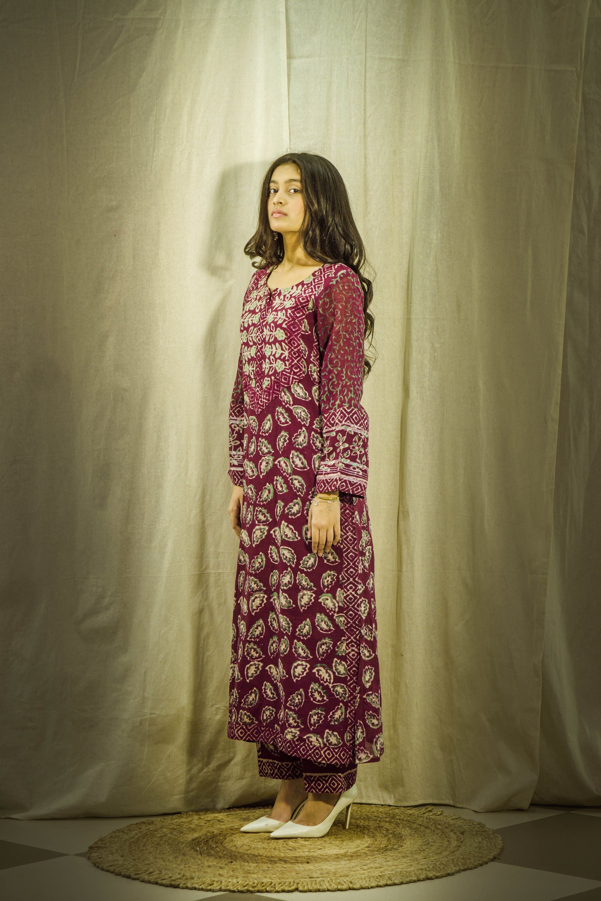 Set against a rich maroon base, the delicate green block printed motifs create a beautiful contrast, adding depth and character to the ensemble. The kurta is fully lined with premium santoon lining, ensuring a smooth finish, enhanced structure, and comfortable wear throughout the day.
