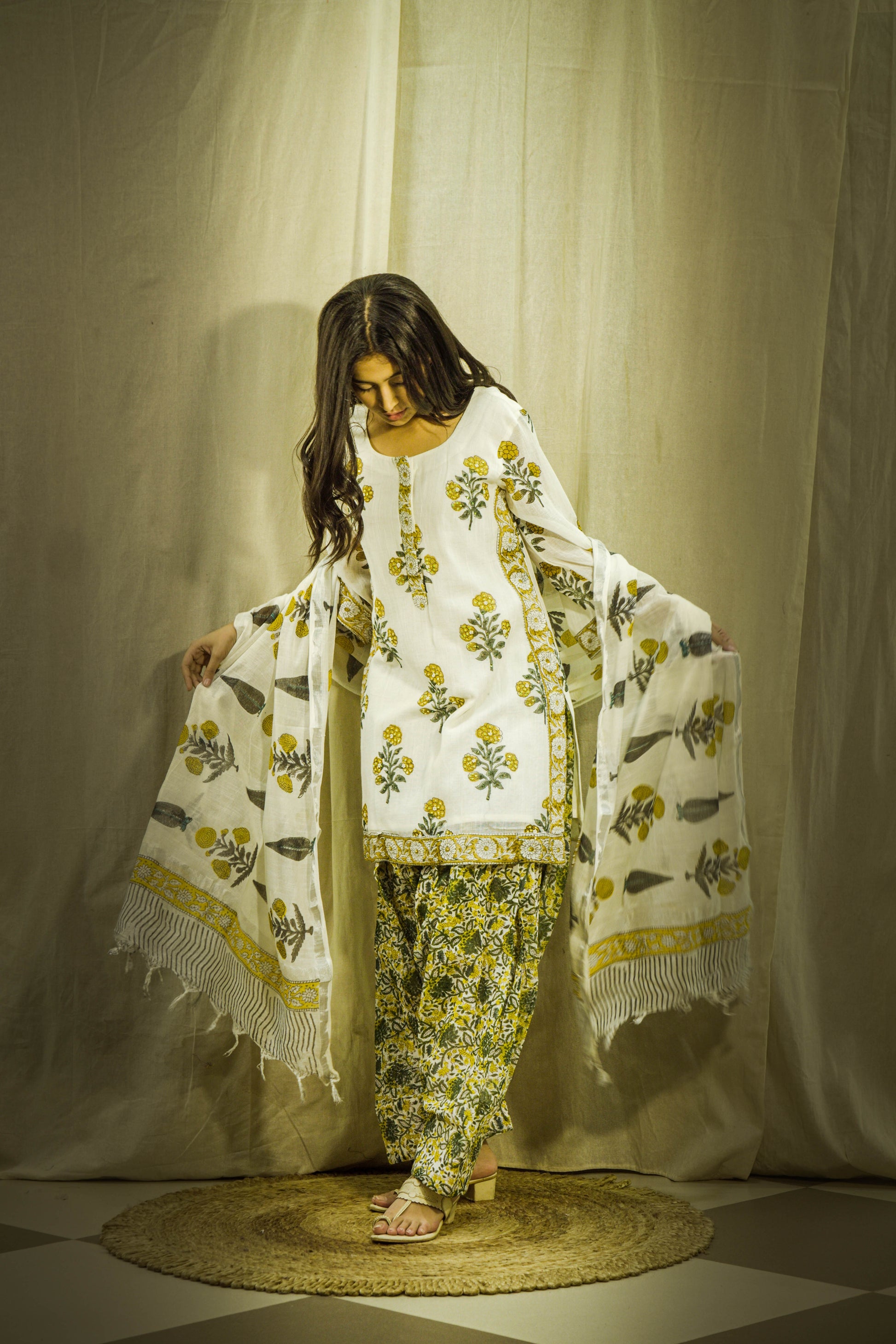Set on a pristine white base, the fabric is adorned with hand block printed motifs, carefully crafted by skilled Indian artisans using traditional printing techniques. The delicate prints enhance the purity of the white linen, giving the ensemble a refined and sophisticated character.