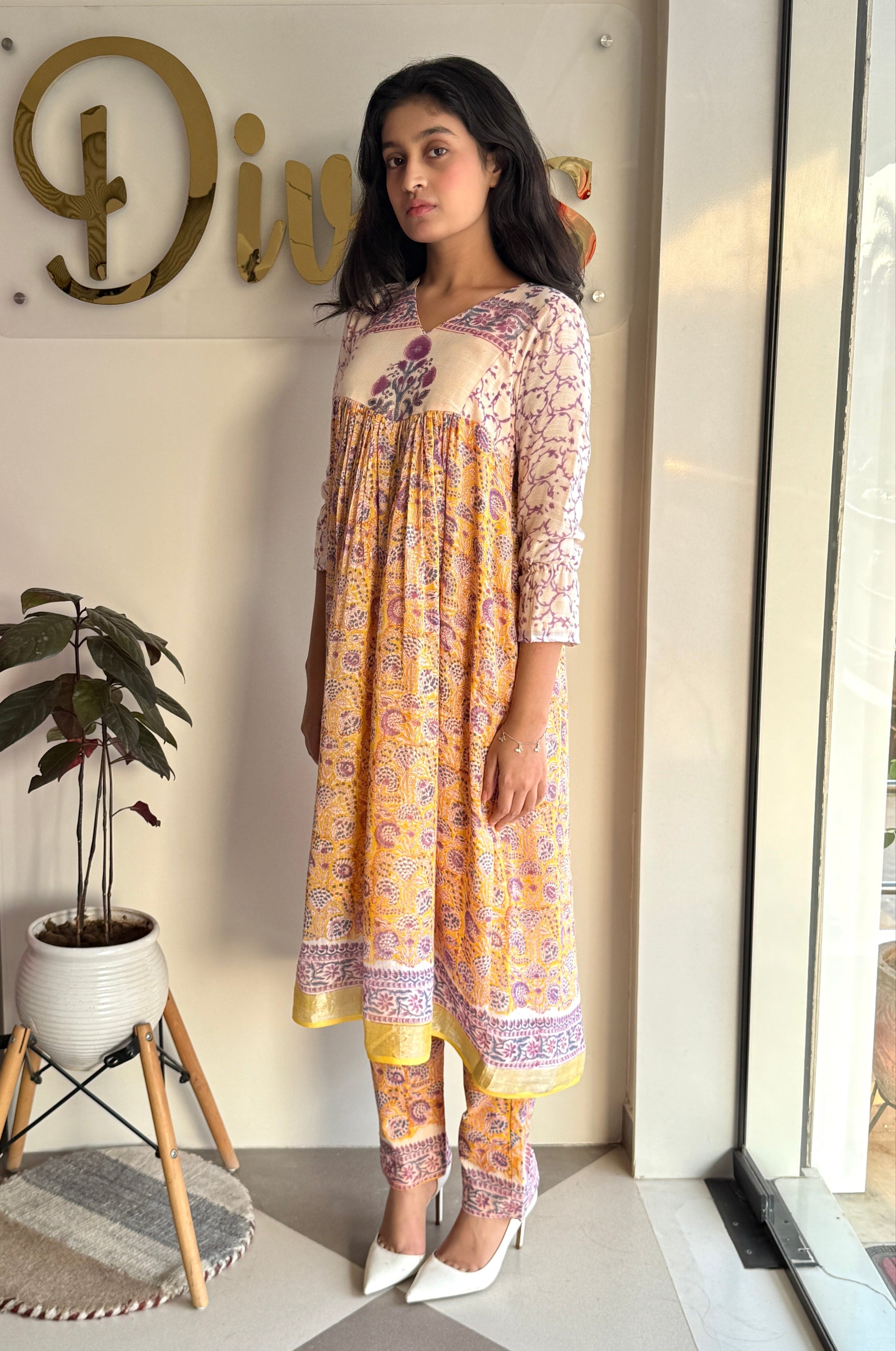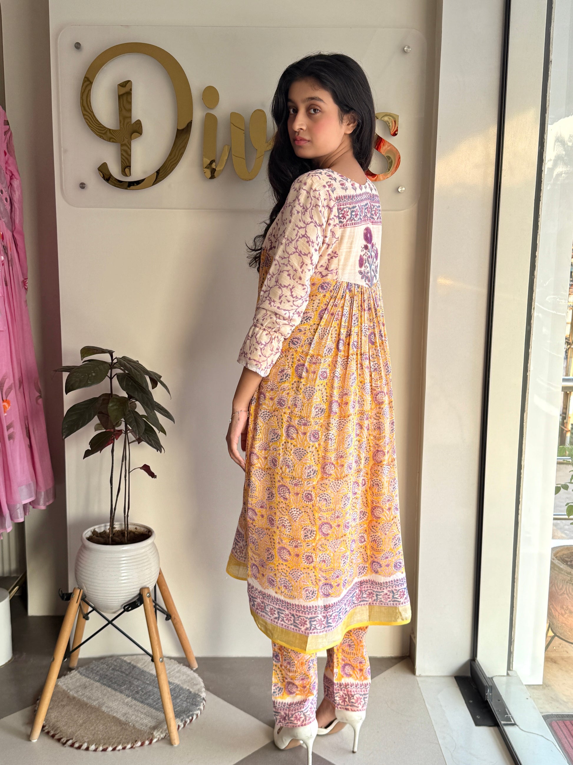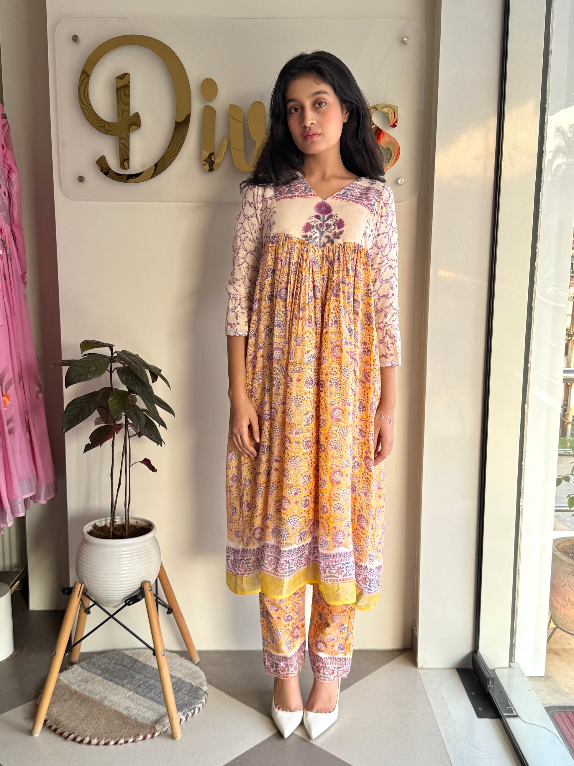 Adorned with hand block prints in a delicate mix of yellow, lilac, and white, the design reflects subtle kalamkari artistry, blending tradition with contemporary elegance. Light, breathable, and effortlessly stylish, this set is the perfect companion for festive occasions and everyday sophistication.
