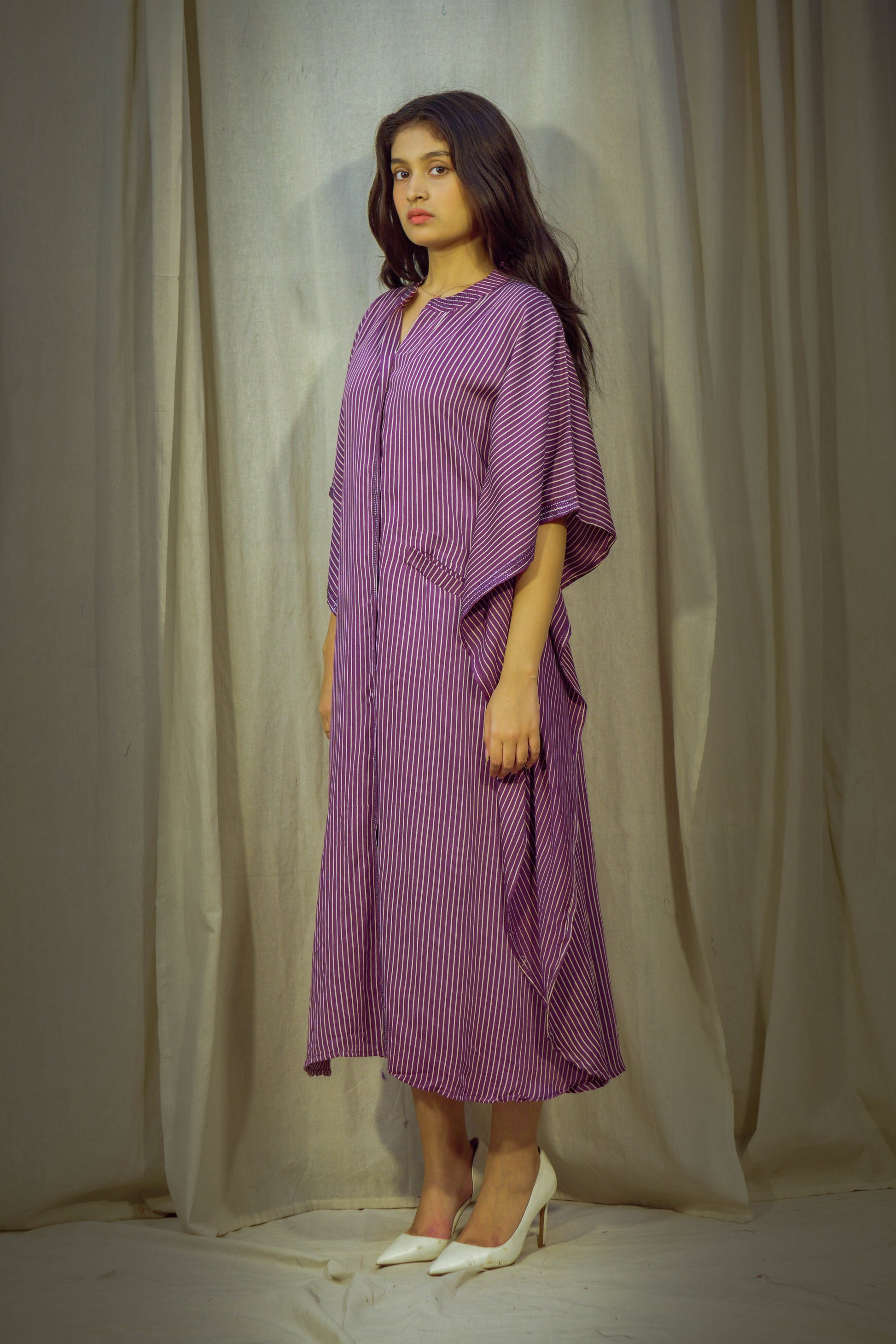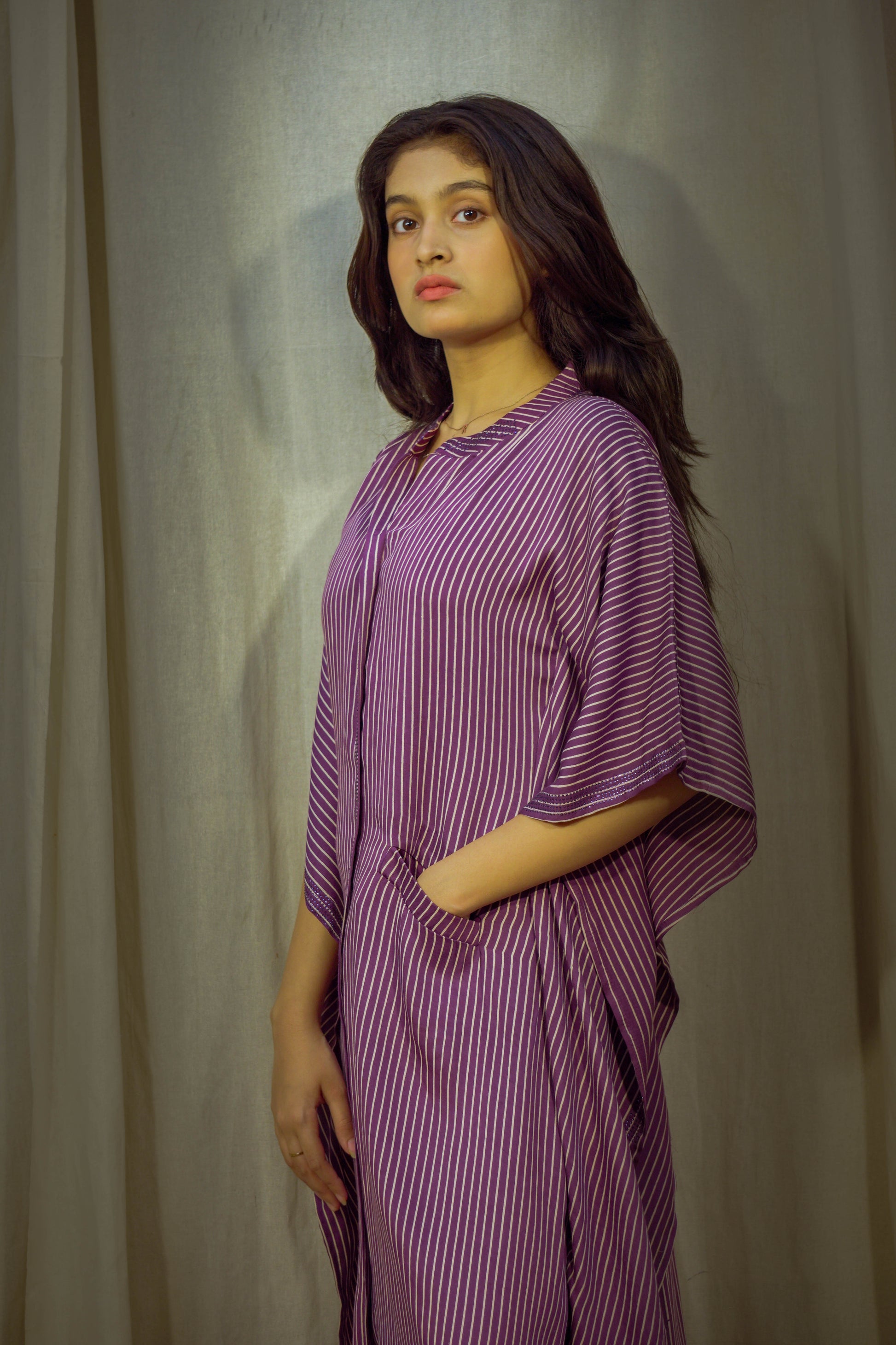 Graceful and effortlessly relaxed, this Purple Kaftan is crafted from luxuriously soft pure modal fabric — light, breathable, and perfect for summer days. The subtle lining print adds a refined texture, while the rich purple hue brings a touch of elegance to your everyday wardrobe. Designed with comfort in mind, it features a relaxed silhouette and practical pockets on both sides. Whether you're lounging or stepping out, this kaftan offers easy sophistication with every wear.