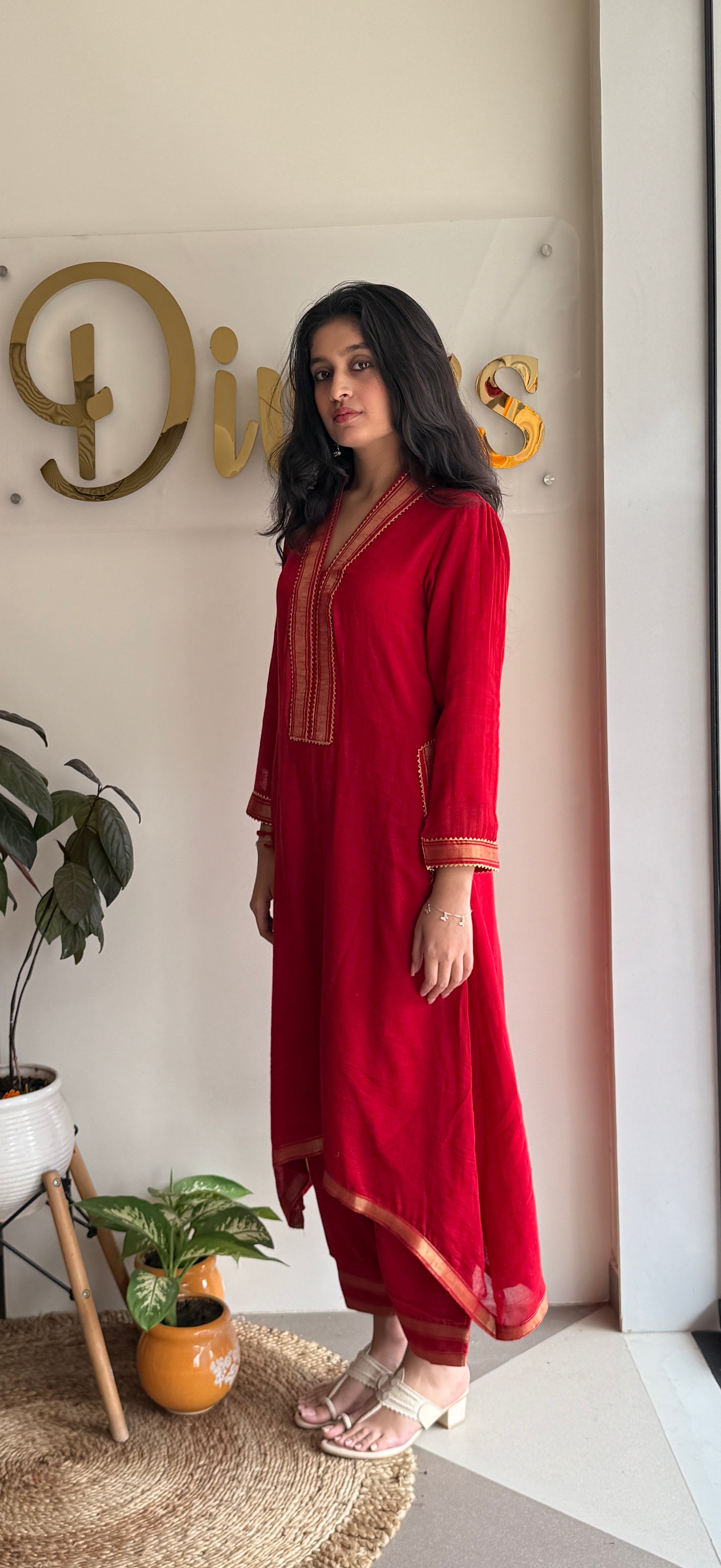 The rich red hue symbolizes celebration, while the delicate golden borders add a touch of opulence — making this outfit a beautiful choice for festive gatherings, family functions, or elegant evening soirees.
