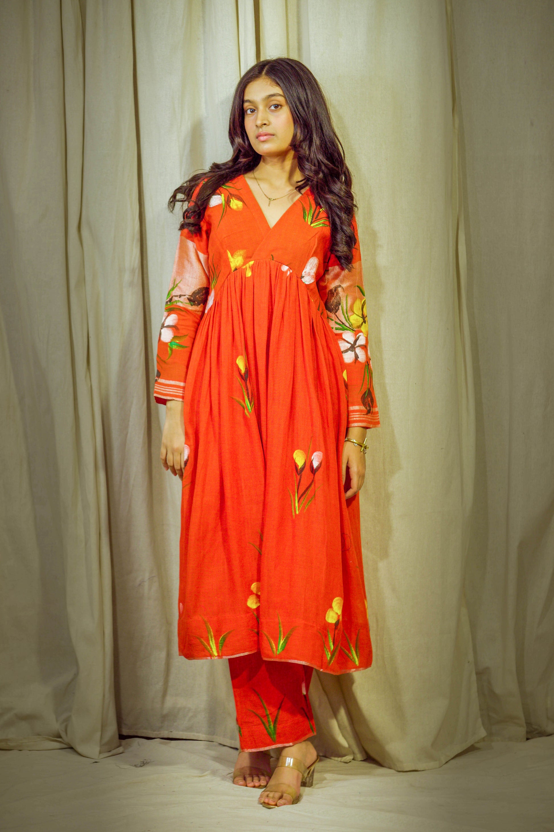 Elevate your everyday elegance with Ruhani Radiance – a timeless pant-kurta set crafted in pure linen, dyed in a vibrant orangish-red hue that embodies warmth and spirit. Each piece is adorned with hand-painted motifs, lovingly brought to life by skilled artisans of India, celebrating traditional craft with a modern sensibility.