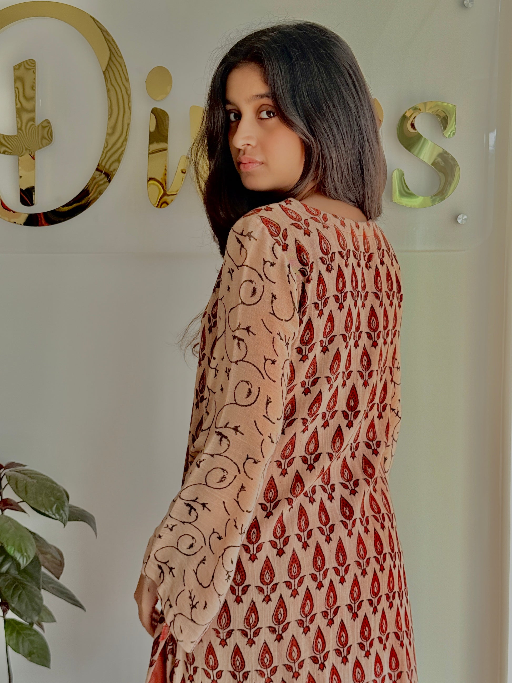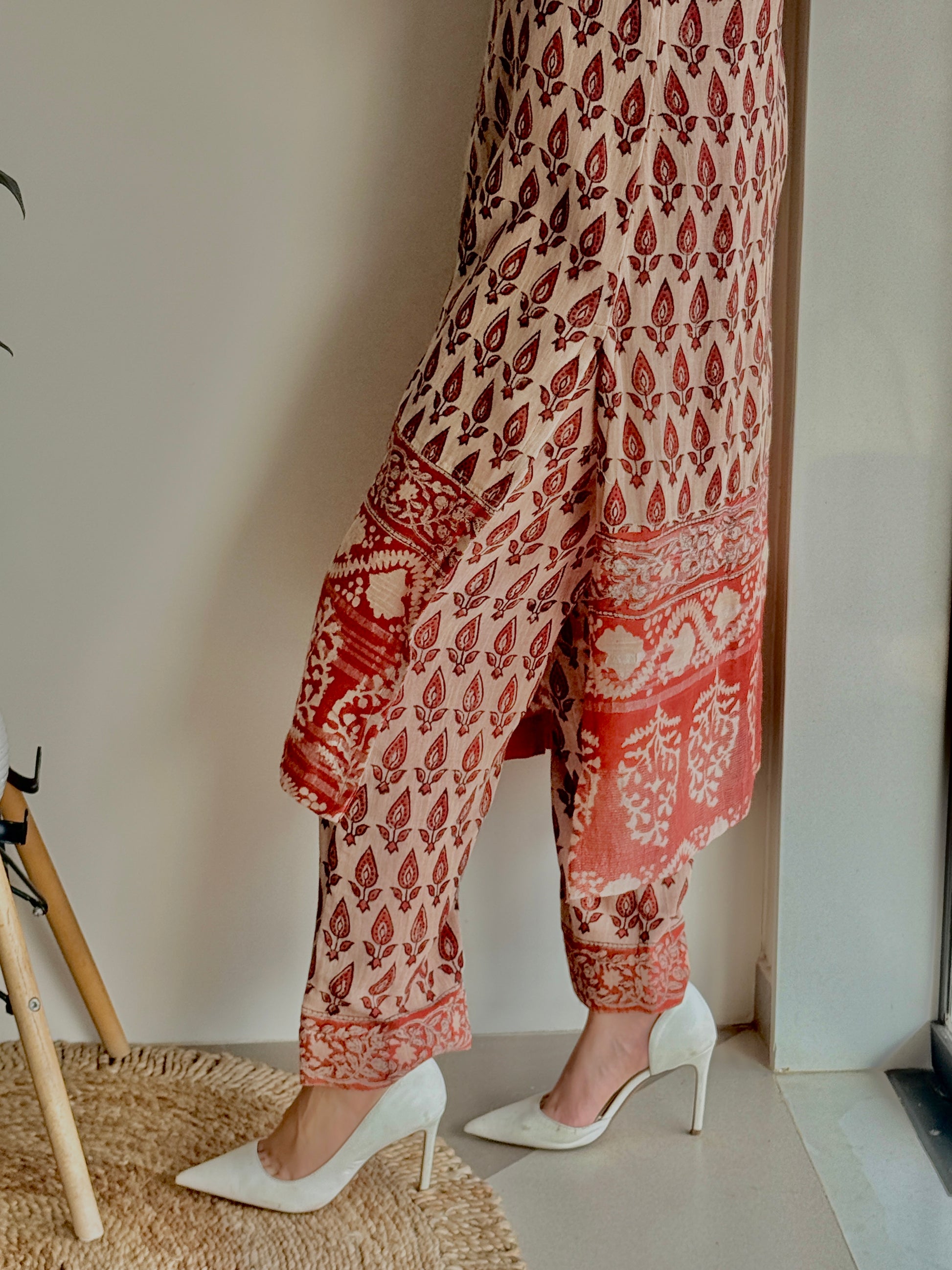 The Rustic Radiance Linen Set celebrates the beauty of heritage craft and mindful fashion. Hand block printed by skilled artisans of India, every detail reflects patience, precision, and tradition. Made in pure linen with a breathable mull cotton lining, this red and beige ensemble is designed for absolute comfort in all climates. A piece that carries the story of artistry, culture, and timeless style — crafted just for you.