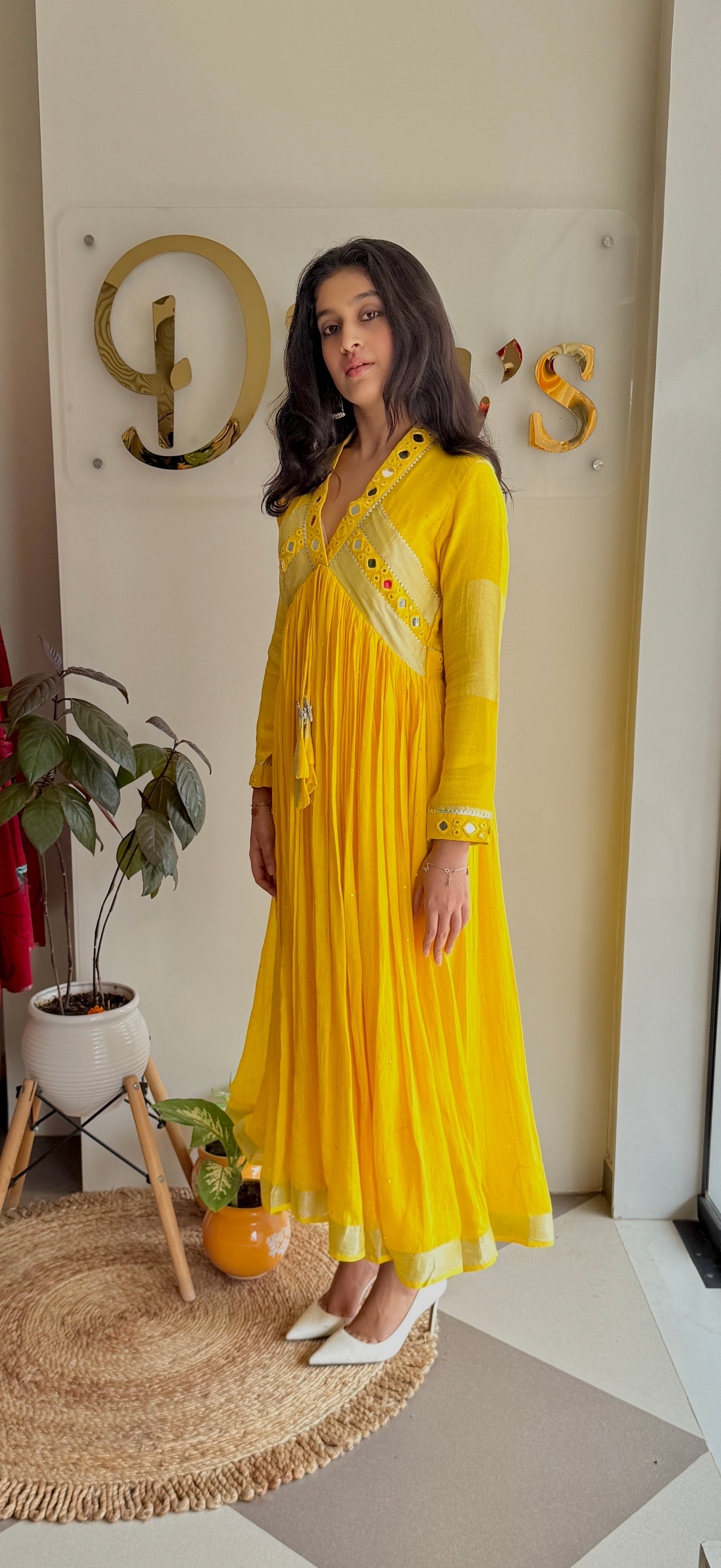 Radiant and timeless, Saanvi is a celebration of sunshine and tradition. Crafted in pure linen fabric with a soft mull cotton lining, this dress combines effortless comfort with handcrafted elegance.