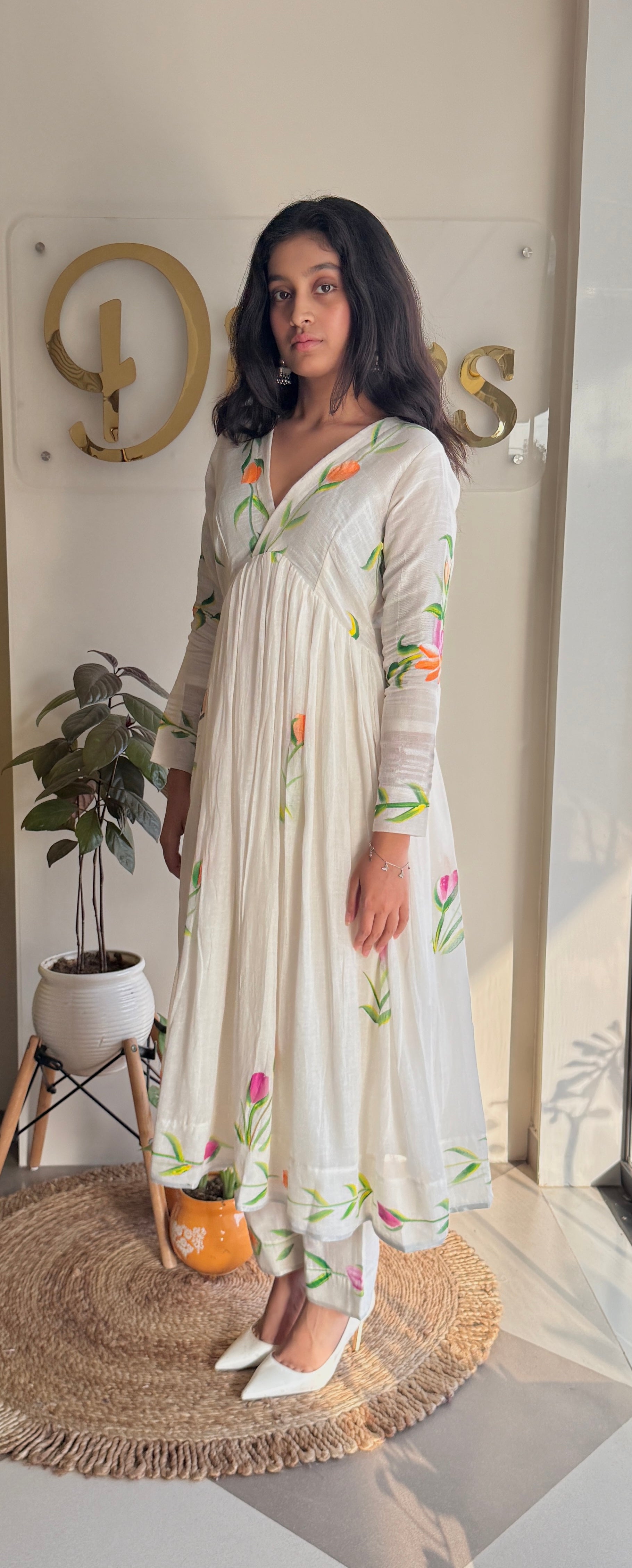 Fabric: Pure Linen with full Mull Cotton Lining Artistry: Hand-painted by Indian Artisans Color: White base with floral motifs Includes: Kurta & Pants