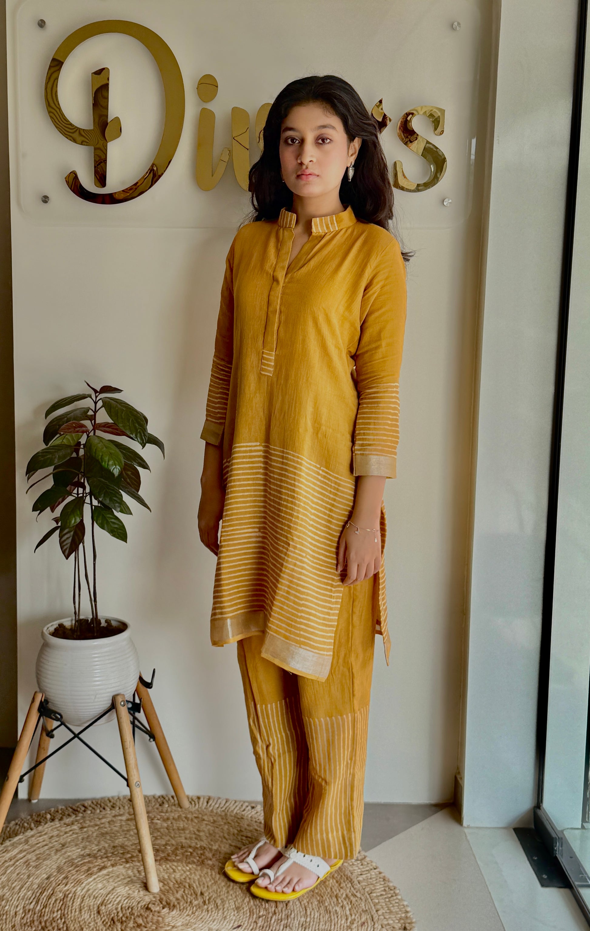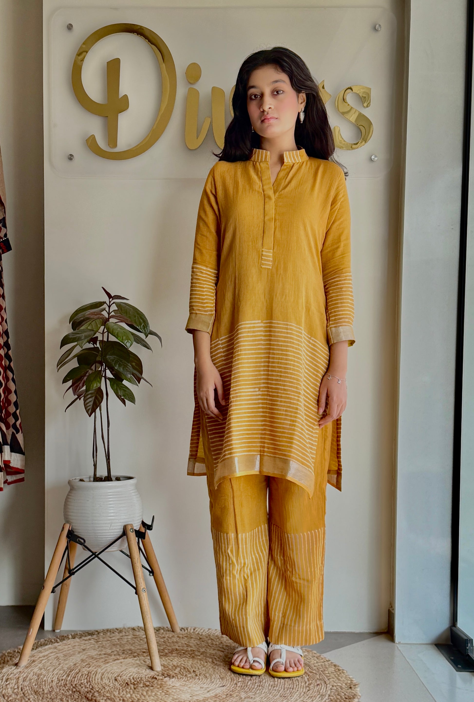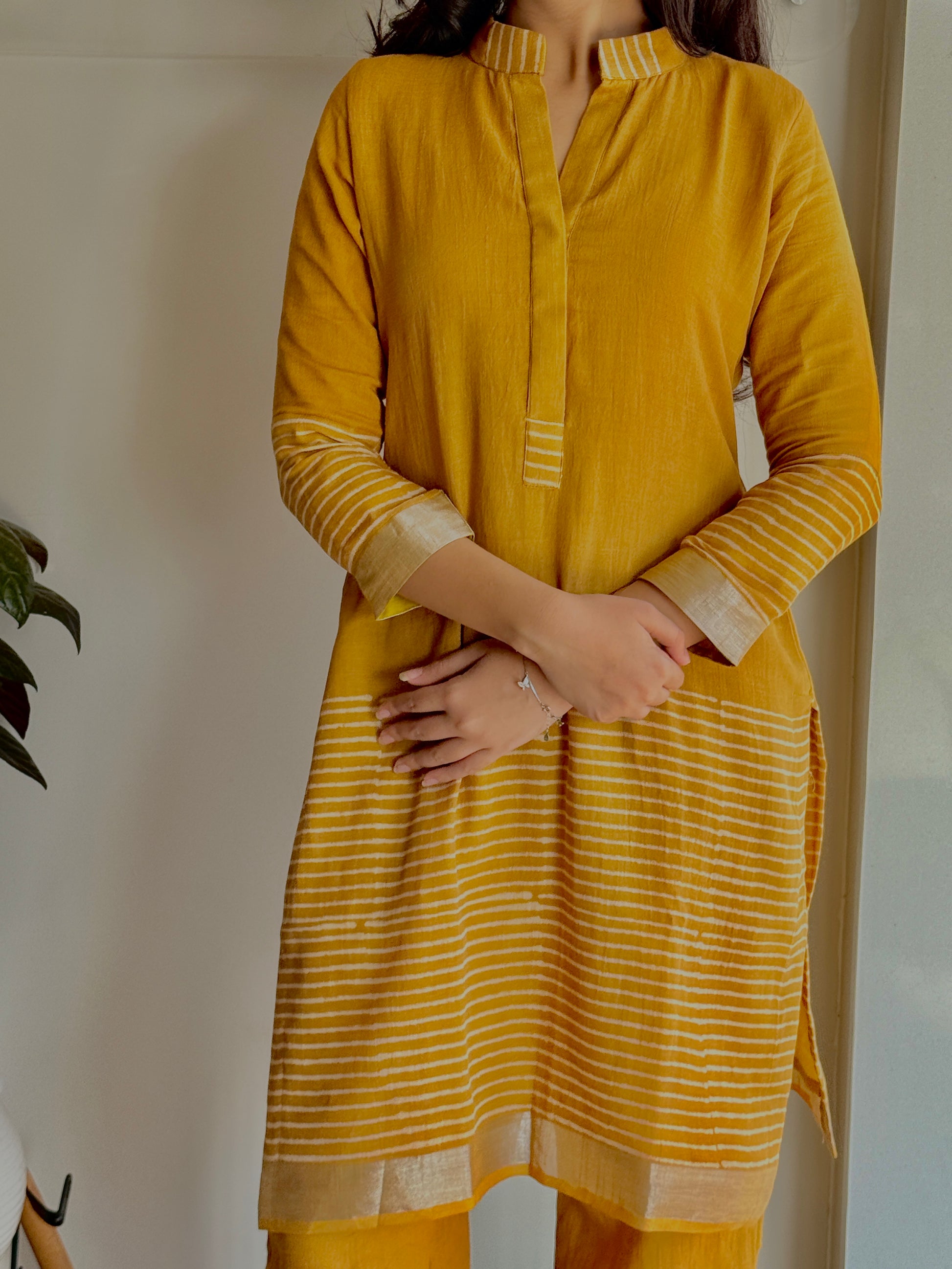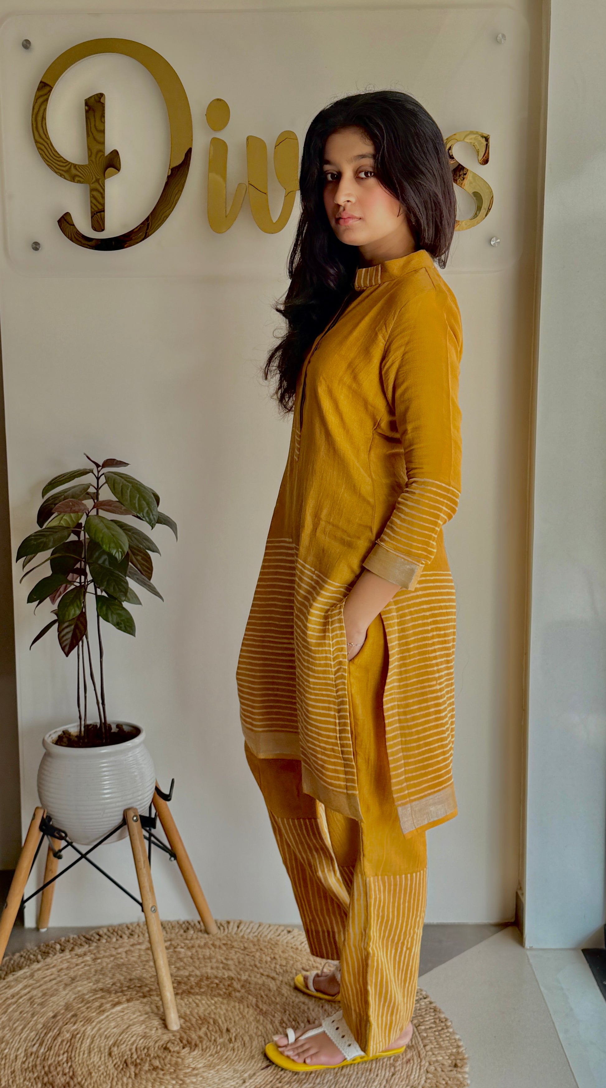 The Sutradhar Cord Set is where functionality meets artisanal elegance. Crafted in pure linen and thoughtfully lined with soft mull cotton, this ensemble ensures unmatched comfort for office hours, daily wear, or relaxed outings. The kurta features delicate white horizontal block-printed lines at the bottom, while the pants mirror the design with vertical lines and pockets on both sides — a subtle play on balance and symmetry. Hand block printed by skilled Indian artisans, this mustard yellow set carries a refined blend of comfort, heritage, and everyday sophistication.