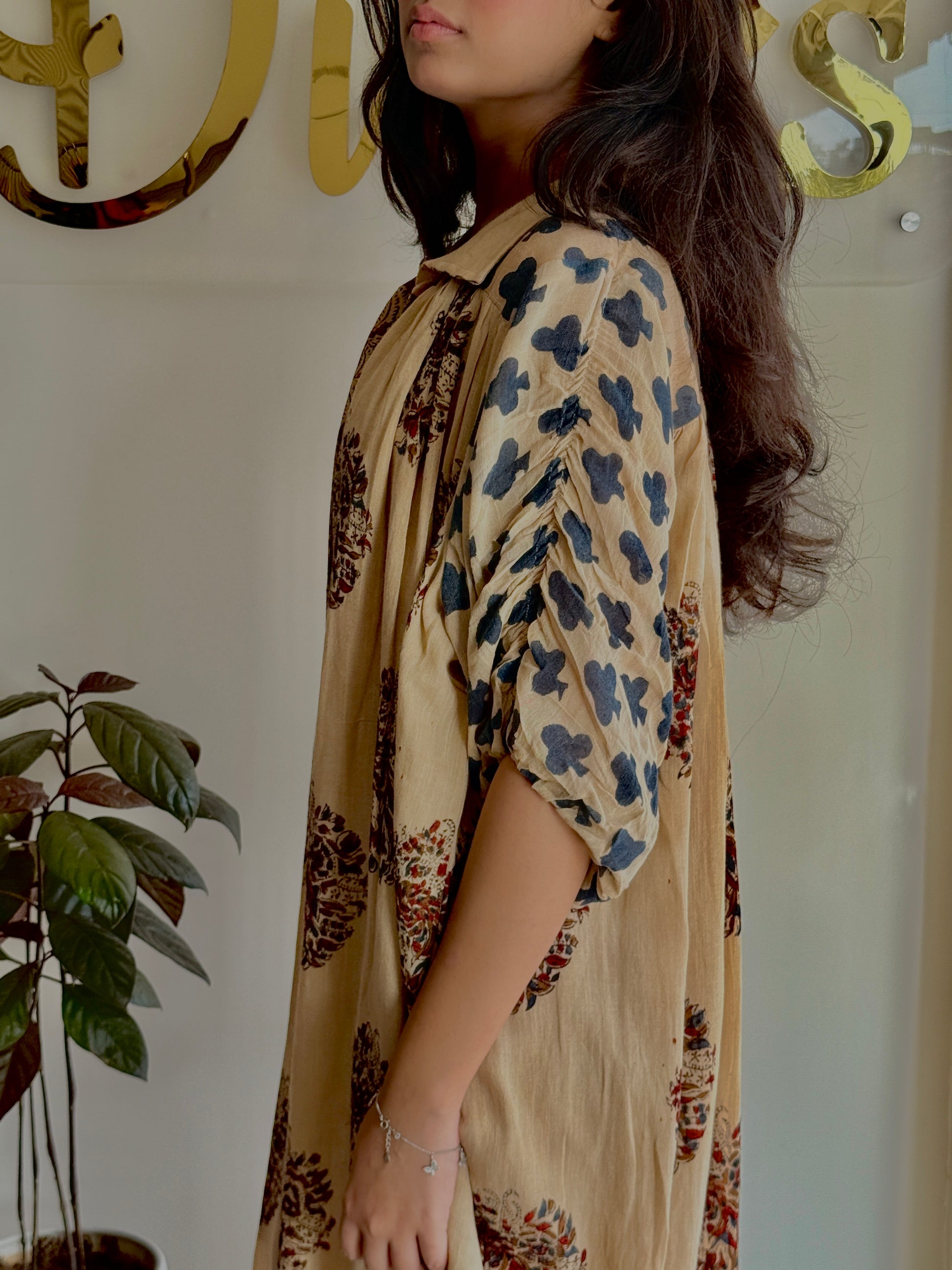 The Tvara Sand Tunic brings understated elegance to versatile styling. Crafted in pure linen with a soft mull cotton lining, it can be worn as a tunic, styled as a dress, or layered as a shirt with jeans or trousers. The soothing cream-beige hue is adorned with artisanal hand block prints, making it both timeless and contemporary. Graceful, adaptable, and effortlessly chic — this tunic is designed for every mood and occasion.