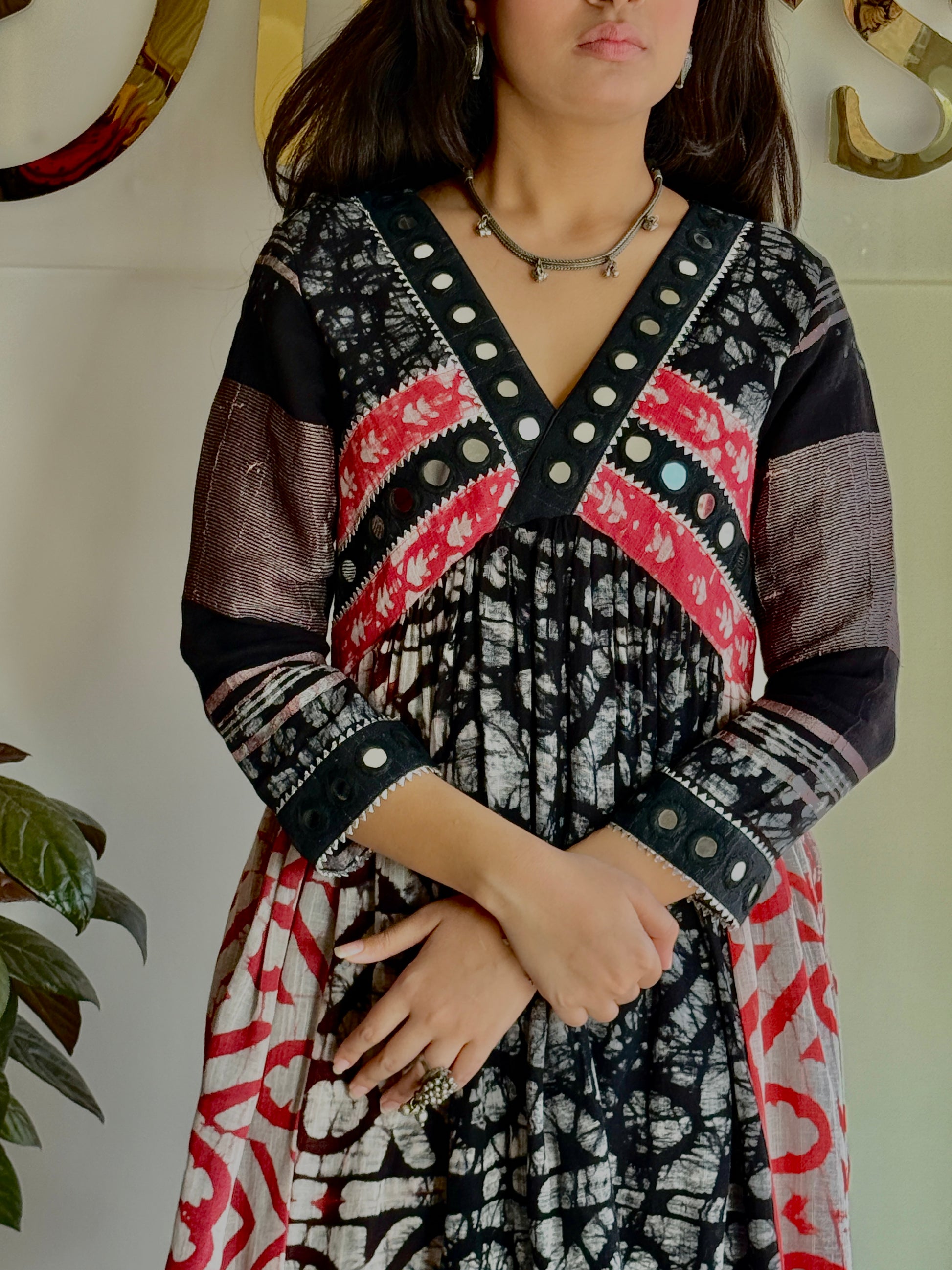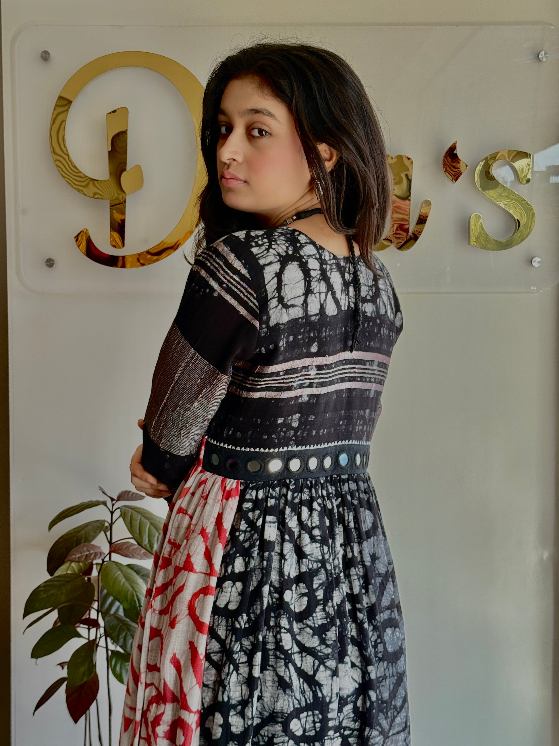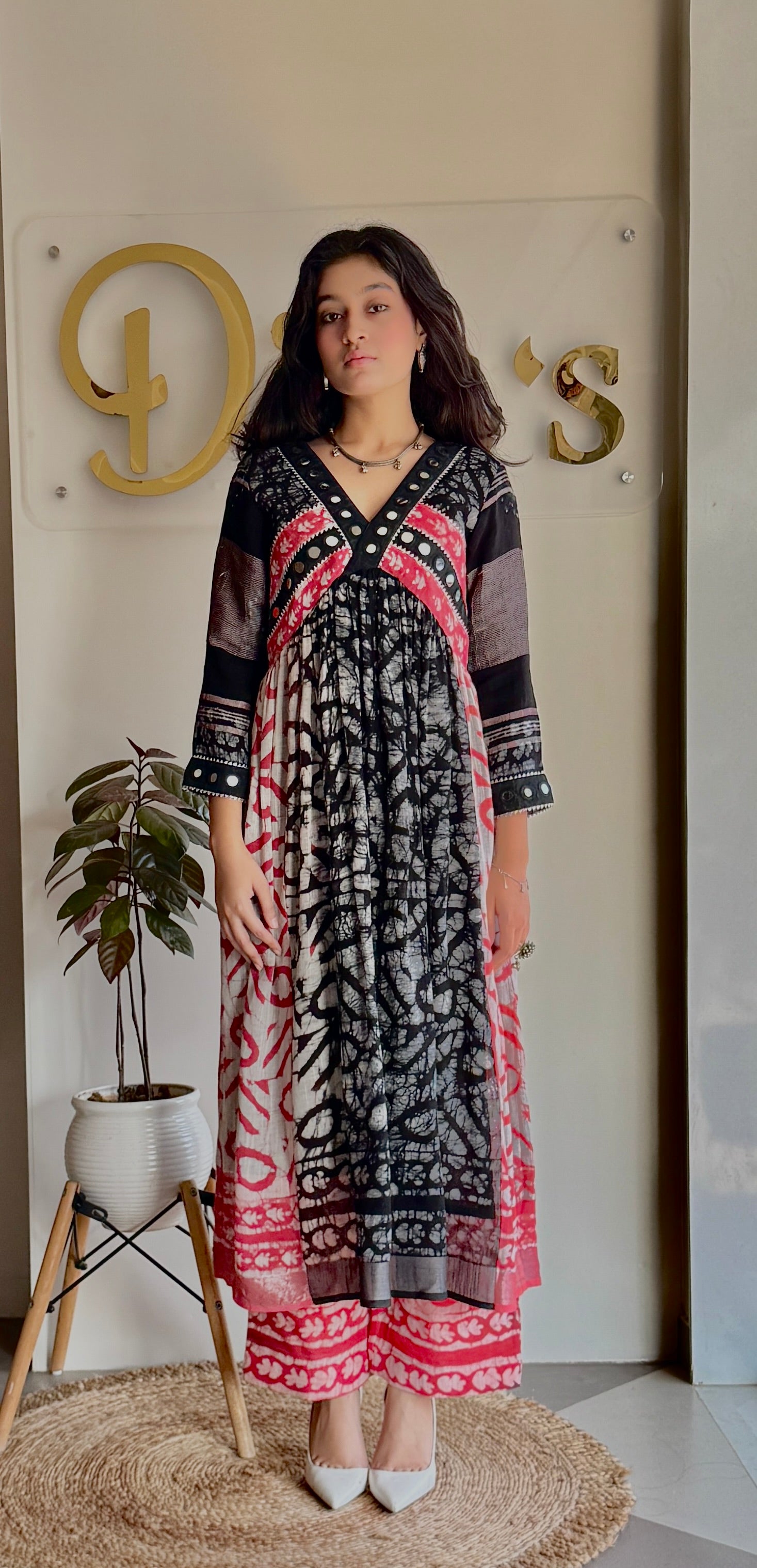 The Zyra Batik Set is a contemporary take on traditional artistry. Crafted in pure linen and lined with soft mull cotton, this pant kurta set features striking batik block prints in shades of orange, black, and white. Mirror work on the neckline and handcuffs, along with a mirror-embellished belt at the back, adds subtle sparkle and sophistication. Side slits on the kurta ensure ease of movement, making this ensemble a perfect blend of artisanal charm, vibrant colors, and modern elegance.