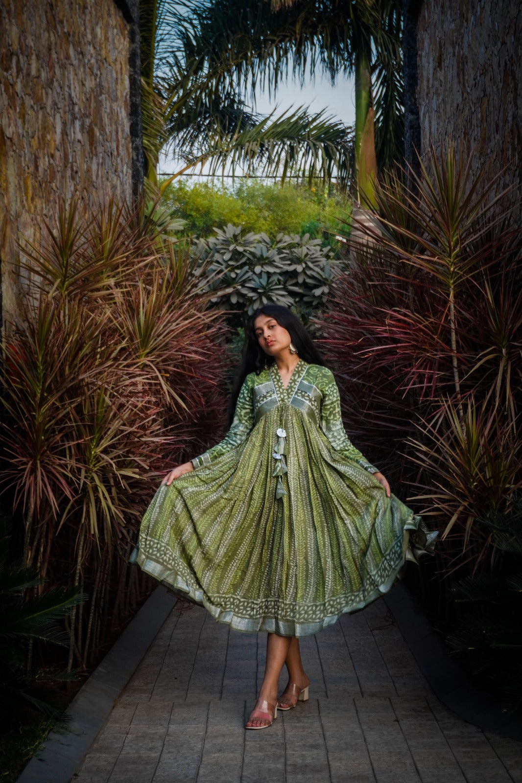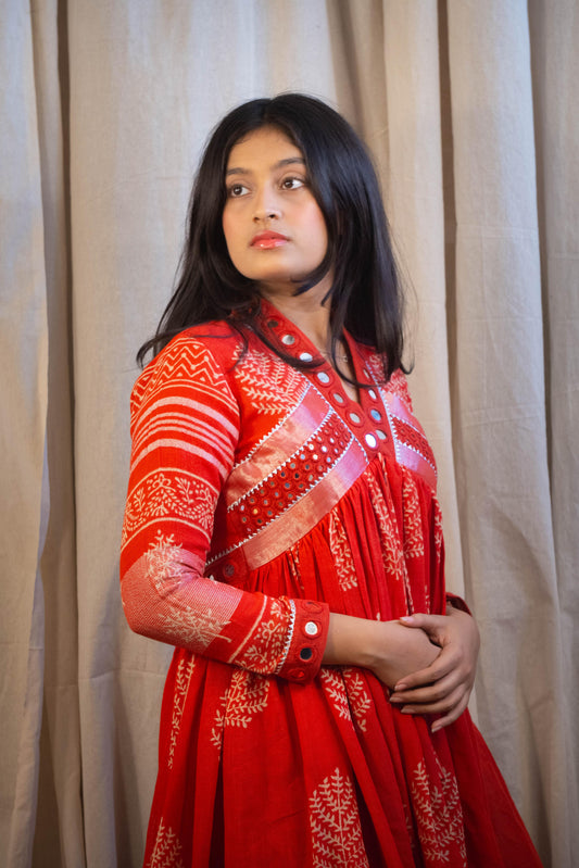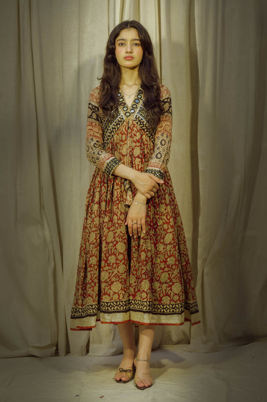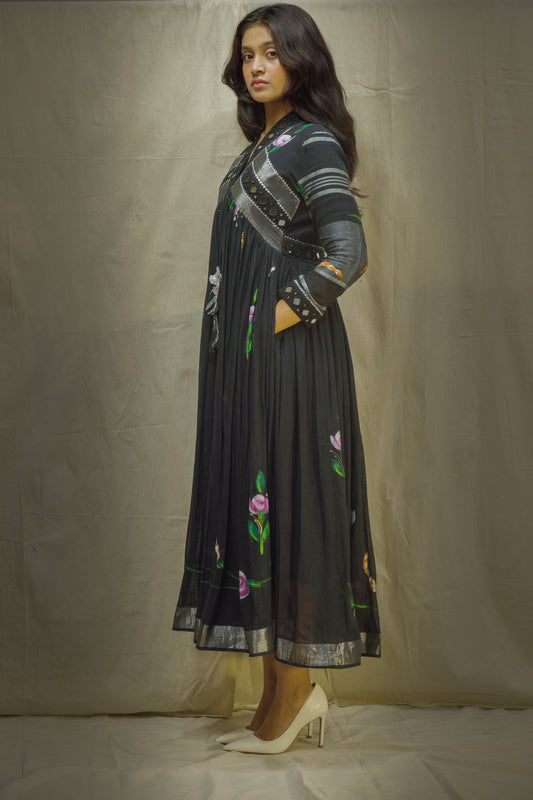 Eternal Blossom – Classic Kalamkari Mirror Work Linen Flared Dress