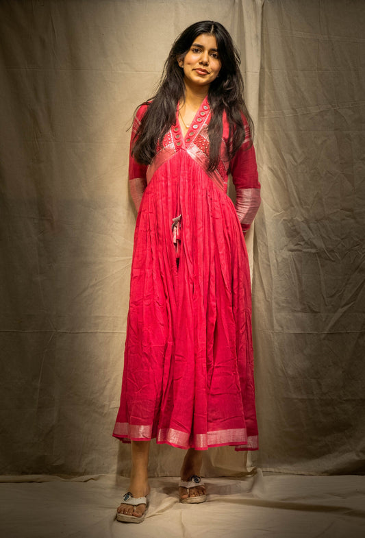 Evara Hot Pink Mirror Work Dress in Pure Linen