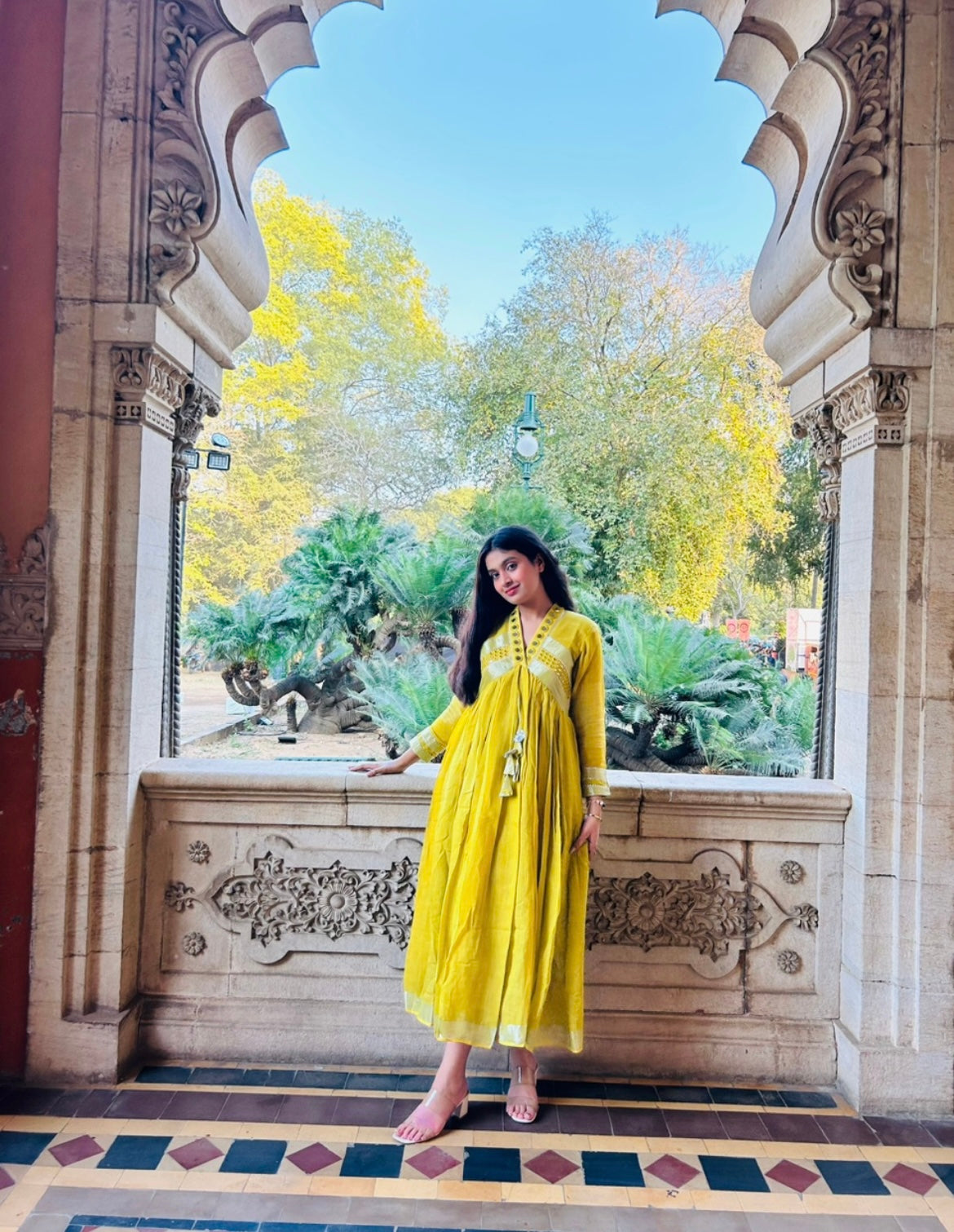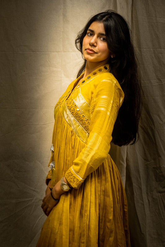 Evara Mustard Mirror Work Dress in Pure Linen