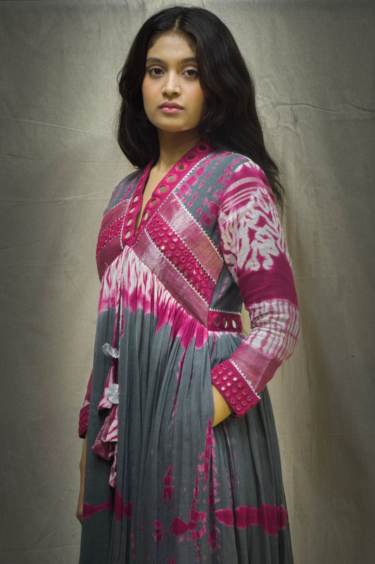 Evara Shibori Pink-Grey Mirror Work Dress in Pure Linen