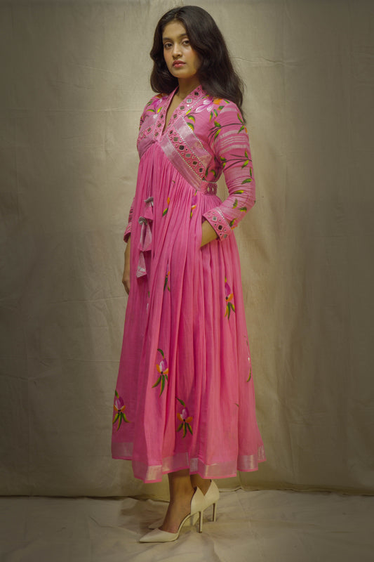 Evara Pink Brush Painted Mirror Work Dress in Pure Linen