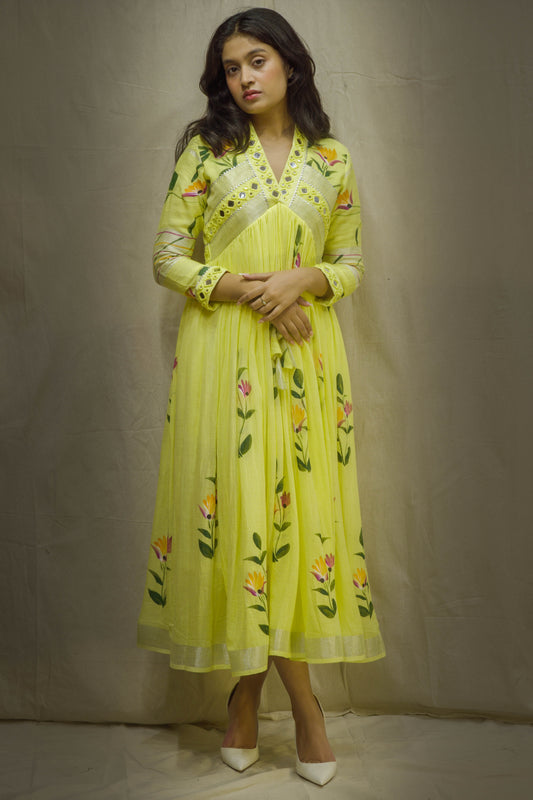 Evara Yellow Brush Painted Mirror Work Dress in Pure Linen